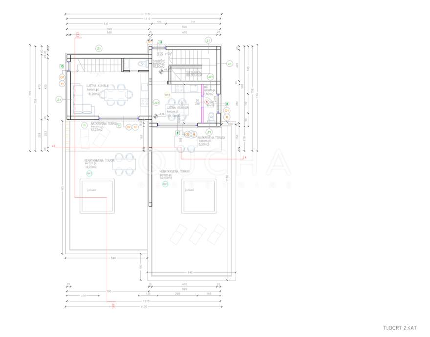 - velike krovne terase s panoramskim pogledom na more - 39,65 m2 nenatkriveni dio i 12,26 m2 natkriveni dio (priključak za vanjski tuš i jacuzzi)