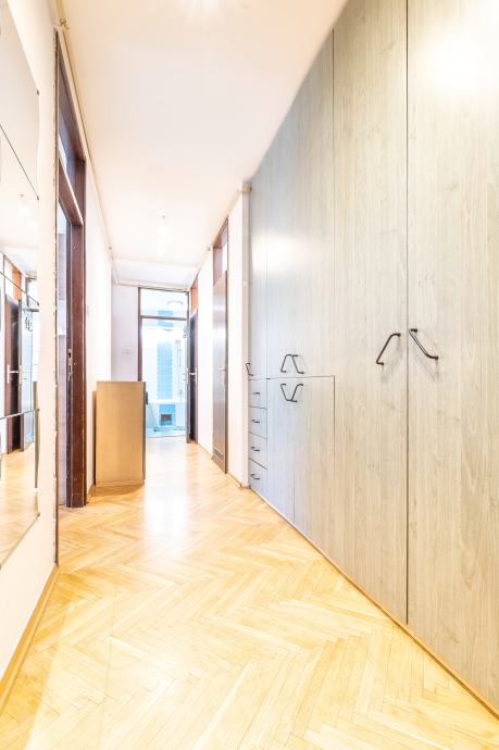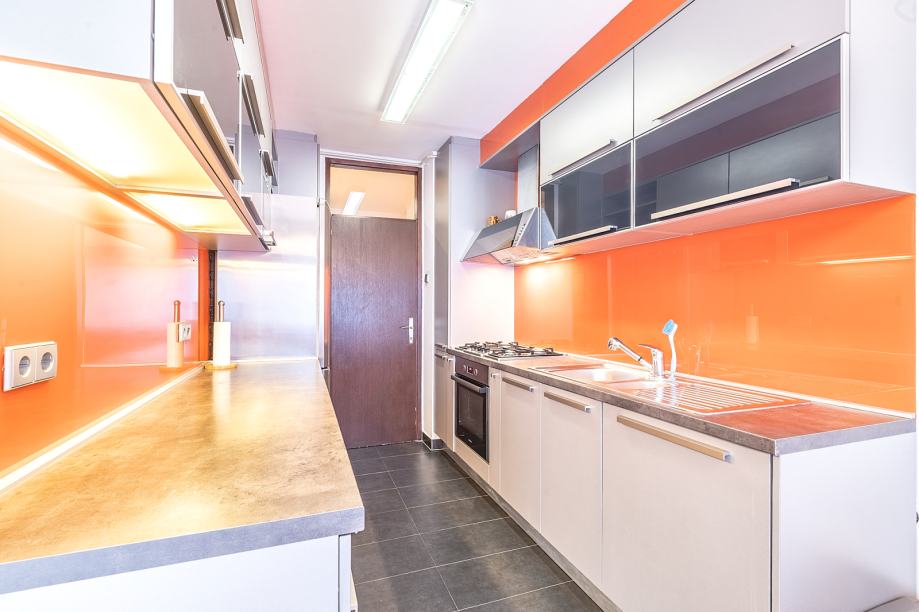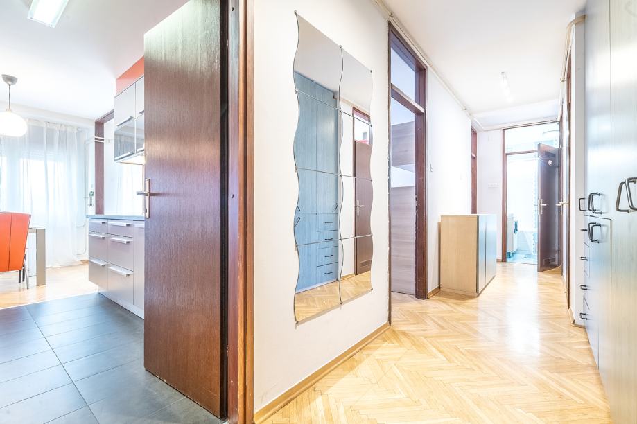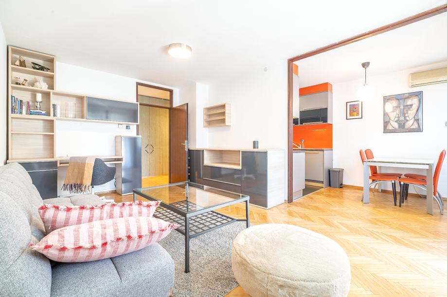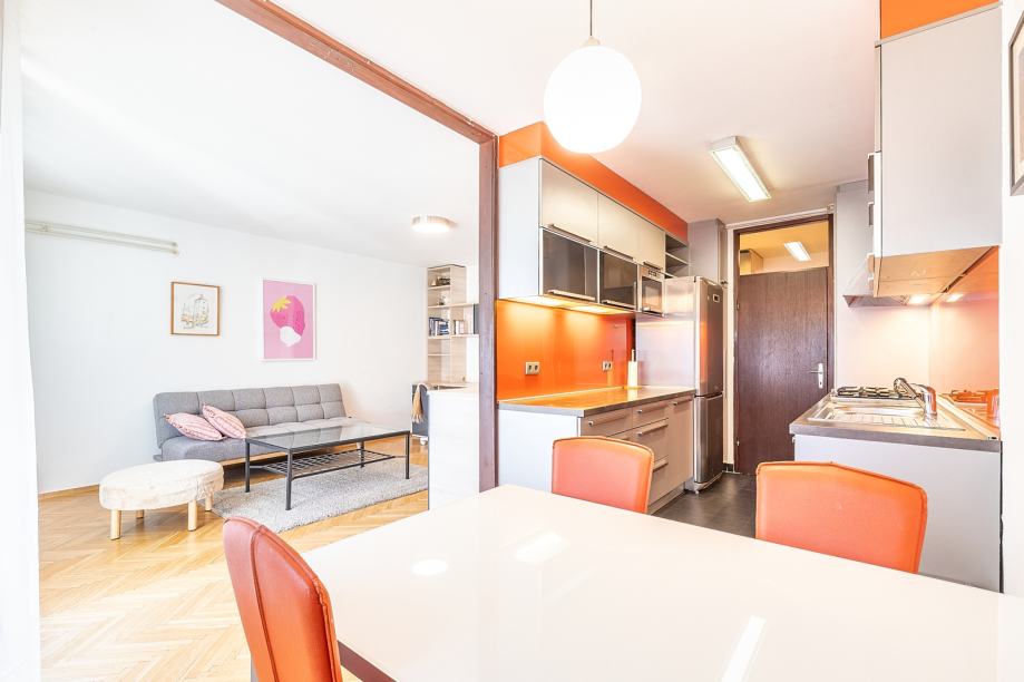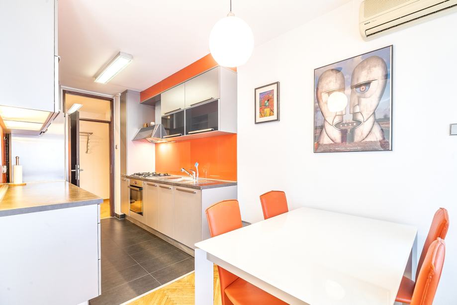 Ovaj svijetao i prostran stan pružit će ti dovoljno prostora za udoban život. Veliki prozori ispunjavaju prostor prirodnim svjetlom i stvaraju ugodnu atmosferu. Stan je potpuno opremljen svime što ti je potrebno za ugodan život. Moderni kuhinjski aparati (električna pećnica, plinski štednjak, Faber napa, mikrovalna pećnica, frižider, perilica posuđa), ugradbeni ormari, klima uređaj... sve je na dohvat ruke.