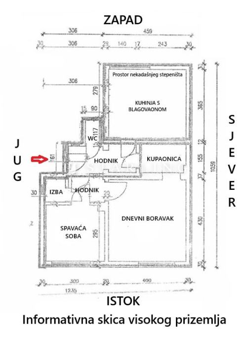 Visoko prizemlje ima ulaz sa strane ceste (glavni) i ulaz s dvorišne strane. Hodnik (ulaz odnosno prolaz) je u zajedničkom vlasništvu sve tri stambene jedinice.