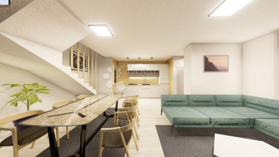 Prostran otvoren prostor s elegantnom kuhinjom, blagovaonicom i dnevnim boravkom