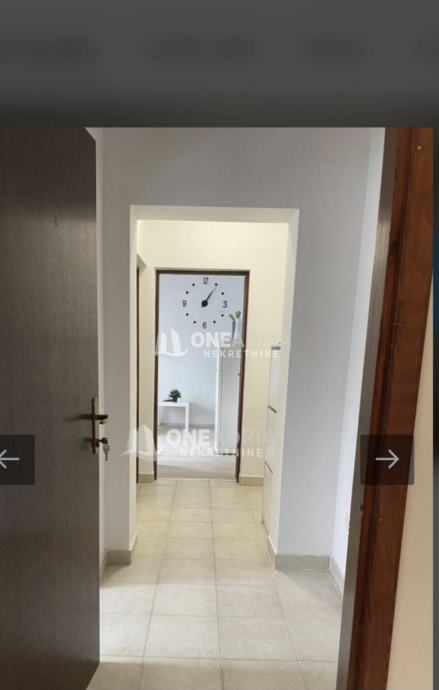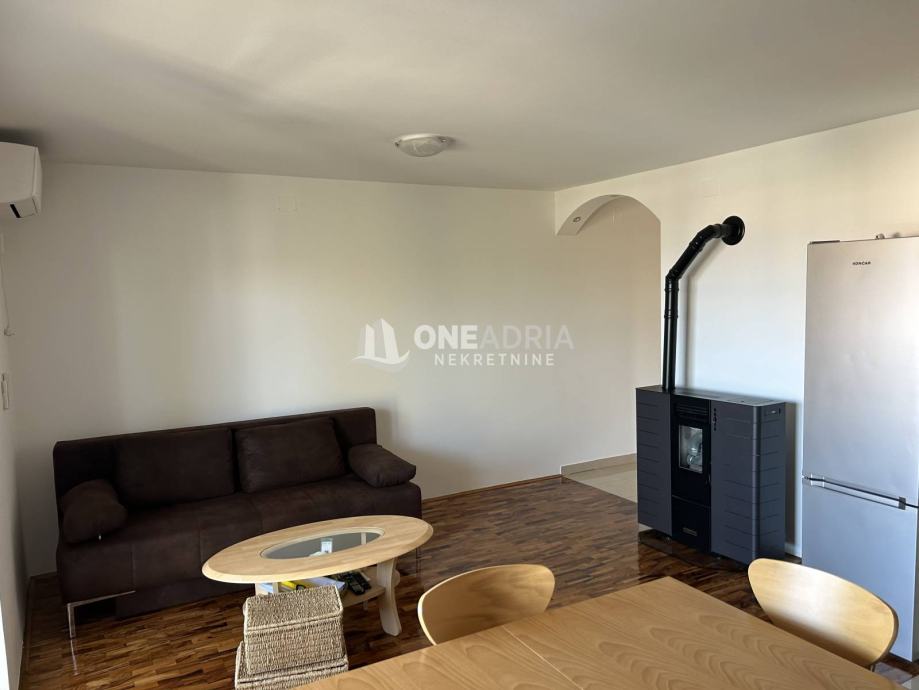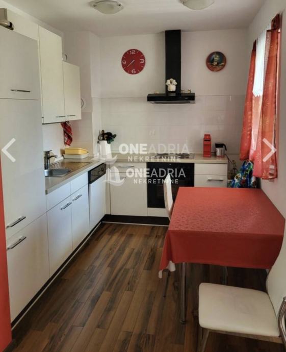 Ukupne površine 66 m², nalazi se na prvom katu stambene zgrade, a sastoji se od ulaznog hodnika, dvije spavaće sobe s izlazom na balkon, kupaonice te kuhinje s blagovaonicom i dnevnim boravkom iz kojeg se izlazi na natkrivenu veću terasu s pogledom na more. Nalazi se na dobroj lokaciji, oko 600 metara od centra mjesta i plaže. Stan je kompletno namješten i prodaje se u kakvom je stanju. Stan ima i novu peć na pelete. Stanu pripada i jedno parkirno mjesto u dvorištu zgrade.
