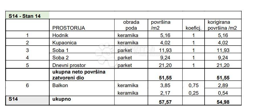 Stan se sastoji od od hodnika, dnevnog boravka s blagavaonicom, 2 spavaće sobe, kupaonice te balkona.