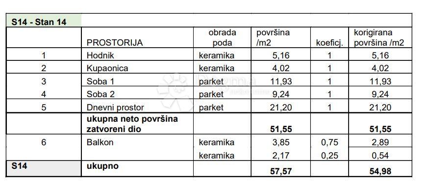 Stan se sastoji od od hodnika, dnevnog boravka s blagavaonicom, 2 spavaće sobe, kupaonice te balkona.