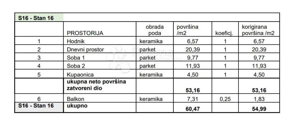 Stan se sastoji od od hodnika, dnevnog boravka s blagavaonicom, 2 spavaće sobe, kupaonice te balkona.
