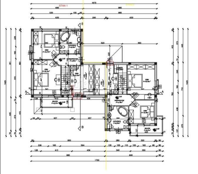 -1.KAT: 3 spavaće sobe od kojih glavna ima izlaz na terasu, veliku kupaonicu te stubište i pretprostor.