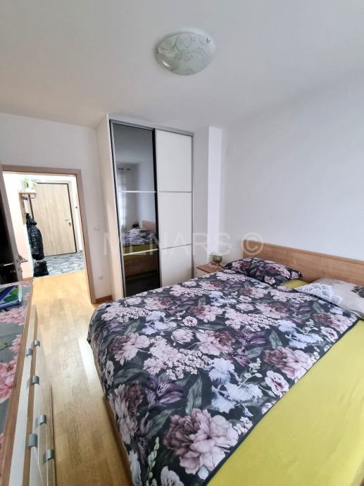 Sastoji od hodnika, kuhinje s blagovaonom i dnevnim boravkom, 2 spavaće sobe, kupaone s wc-om i kadom, odvojenog wc-a s tuš kabinom, natkrivene lođe, spremišta u prizemlju zgrade.