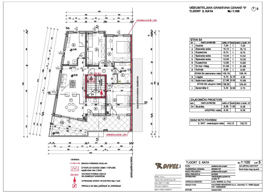 Stan je smješten u zgradi broj 9 na 2. katu te je stambene površine 124,44 m2. Očekivani završetak radova je kraj lipnja 2026 godine.