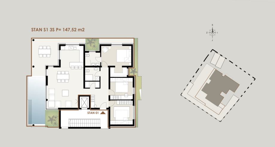 Stan s oznakom S1 ima 101,17 m2 neto tlocrtne površine, nalazi se u prizemlju suvremeno osmišljenog višestambenog objekta, čija je gradnja već započela. Objekt je moderno projektiran i uključuje dizalo. Stan ima funkcionalan i pregledan tlocrt, dobru orijentaciju te ugodnu povezanost unutarnjih prostora sa vanjskim površinama.