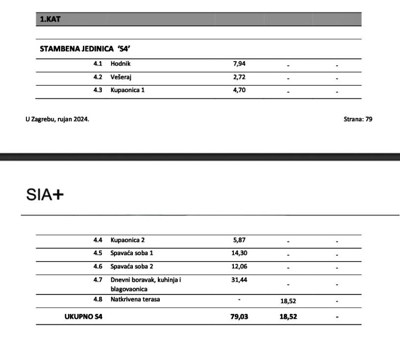 Stan S4 prostire se na 79,03 m2 unutarnje stambene kvadrature, a nalazi se na 1. katu stambene zgrade s liftom. Sastoji se od 2 spavaće sobe, open space dnevnog boravka, kuhinje i blagovaonice, 2 kupaonice s WC-ima, dodatnog vešeraja, ulaznog hodnika, te natkrivene terase tlocrtne površine 18,52 m2. Stanu pripada i vanjsko parkirno mjesto. Ukupna obračunska/prodajna kvadratura stana je 97,55 m2.