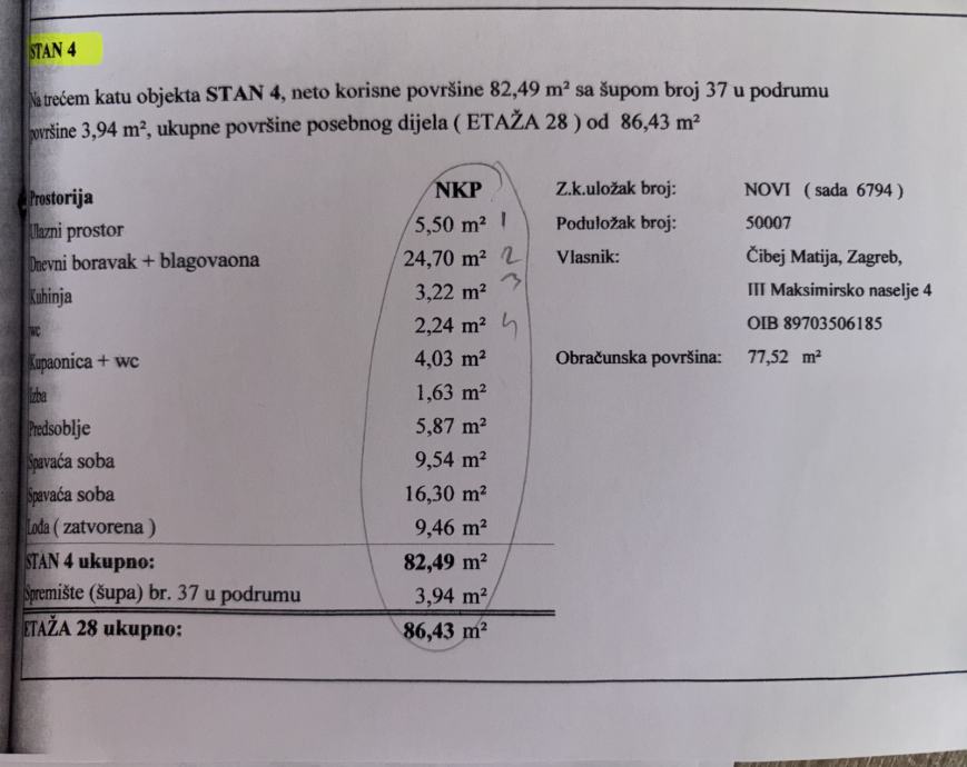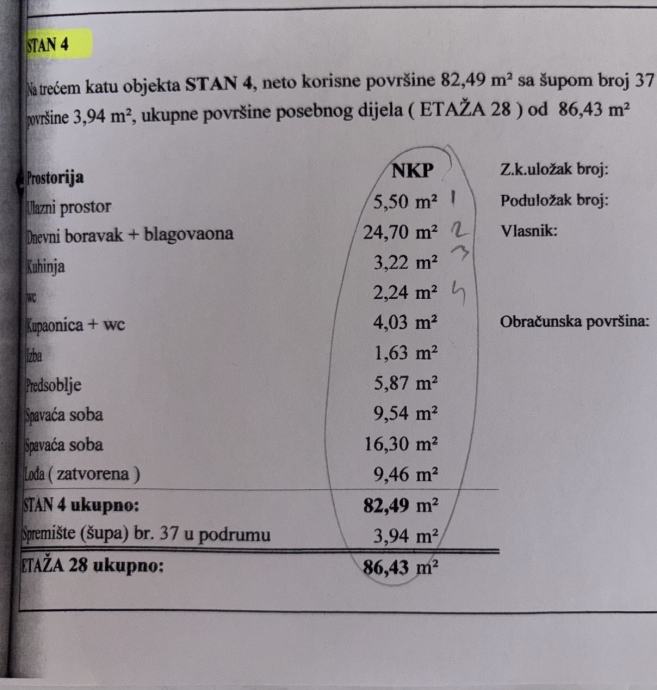 Stan je na trećem od ukupno 4 kata, u zgradi s liftom površine 82,49 čm kojem pripada spremište podrumu površine 3,94 koji a sastoji se od: