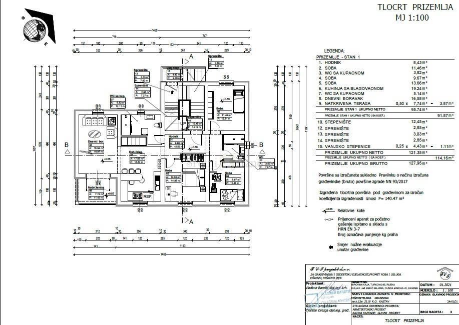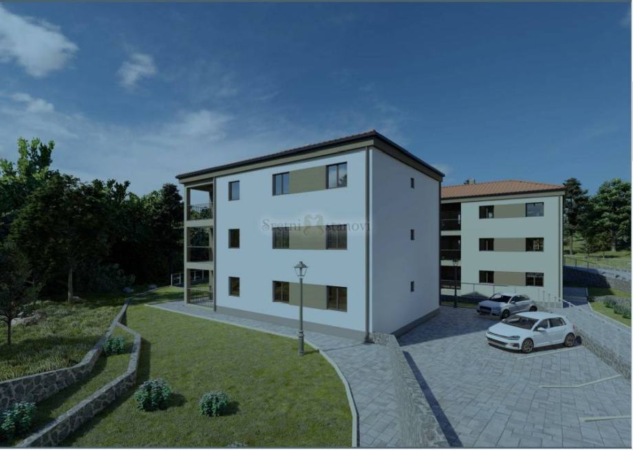 Trosobni stan u prizemlju luksuzne novogradnje u Kastvu, sastoji se od 3 spavaće sobe, dnevng boravka, kuhinje s blagovaonicom, hodnika i 2 wc-a s kupaonicom ukupne stambene površine 91,87 m2, natkrivene terase 7,74 m2 što zajedno sačinjava ukupnu površinu stana od 95,74 m2.