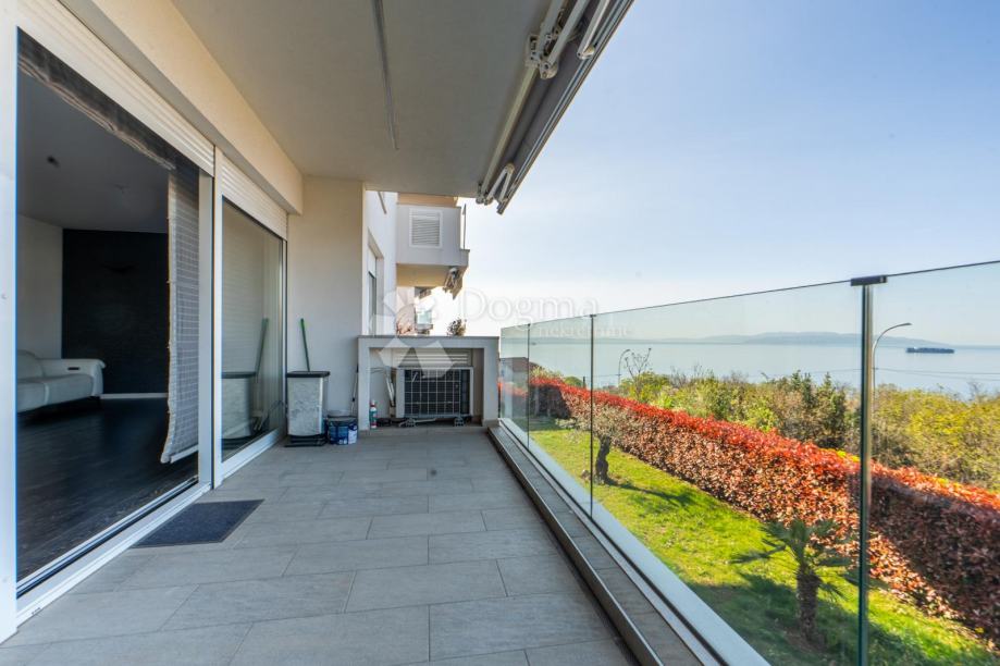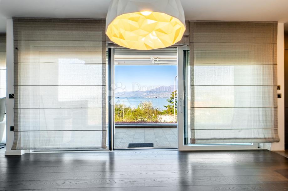 Stan je smješten na prvom katu a sastoji se od: 3 spavaće sobe, open space prostora (u kojem su smješteni dnevni boravak, kuhinja, blagovaonica), hodnika, kupaonice i dodatnog wc, te dva balkona s pogledom na morre. Dnevni dio ima izlaz na veliki balkon na kojem možete kao pravi hedonisti uživati u otvorenom, panoramskom pogledu na more okrženi zelenilom okućnice. Jedna spavaća isoba ima francuski balkon.