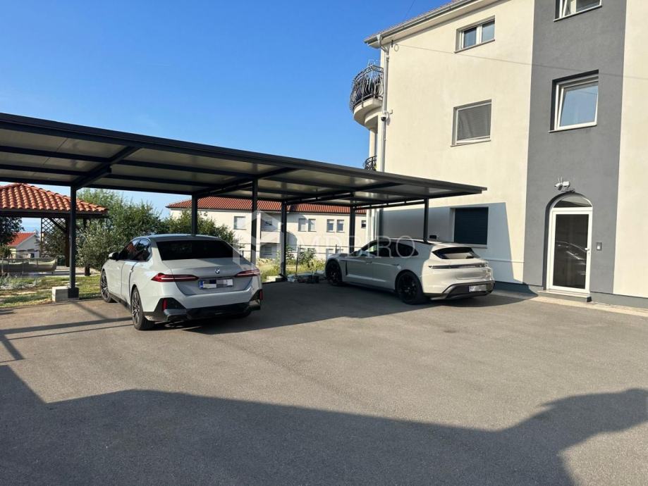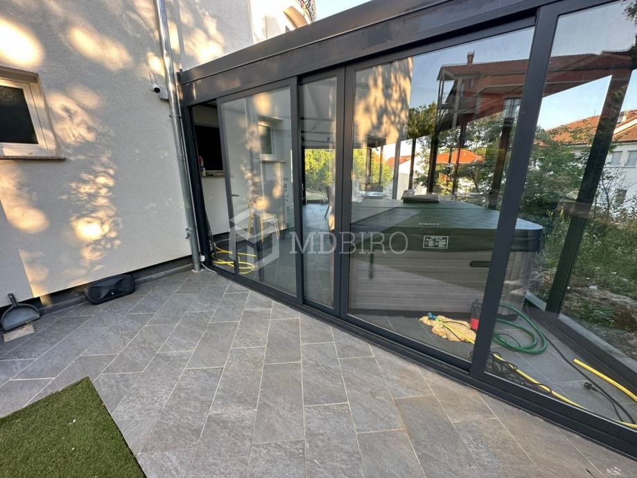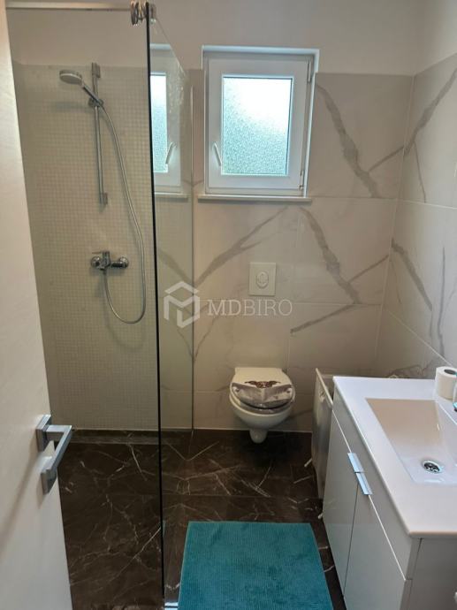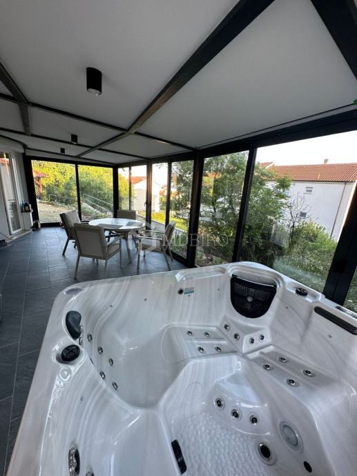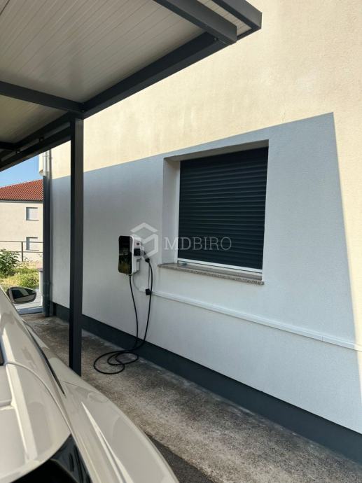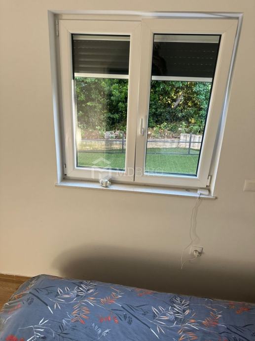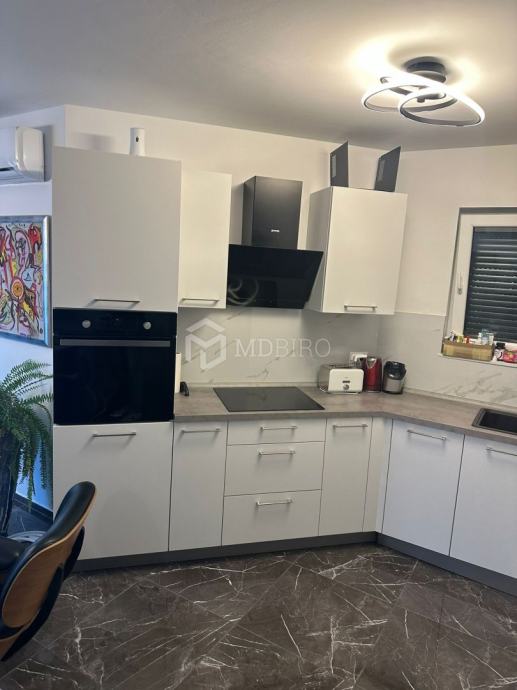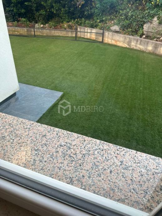 Na savršenoj lokaciji, u neposrednoj blizini autobusne stanice, trgovine i izlaza sa zaobilaznice prodaje se etaža s pogledom na more. Stan se sastoji se od zajedničkog prostora kuhinje, blagovaonice i dnevnog boravka, tri spavaće sobe, hodnika i kupaonice s prozorom, ukupne površine 70 m². Iz dnevnog boravka se izlazi na predivnu natkrivenu i zatvorenu terasu od 40 m² i vrt od 150 m². Terasa je opremljena s vanjskim hidromasažnim bazenom i roštiljem. Dva natkrivena parkirna mjesta na velikoj okućnici s vlastitom punionicom za električna vozila. Podno grijanje, dvije klime. Prodaje se namješteno ili prazno. Idealna nekretnina za novi obiteljski dom na mirnoj lokaciji van gradske buke, a opet blizu svih važnih sadržaja. RIJETKOST NA TRŽIŠTU! SAMO PUTEM NAŠE AGENCIJE!