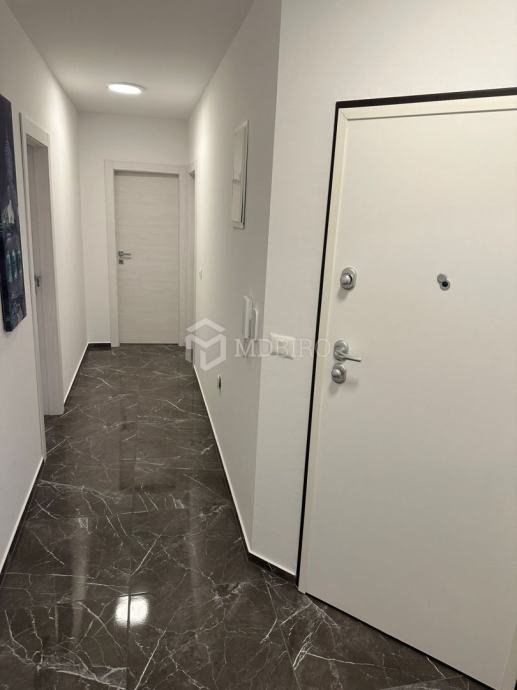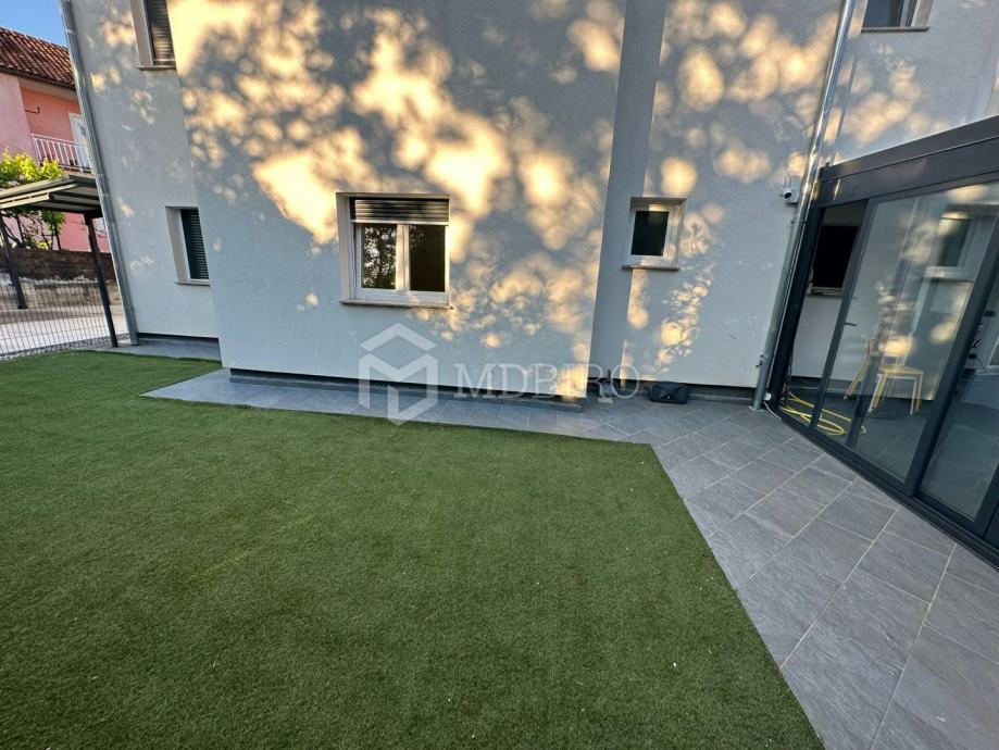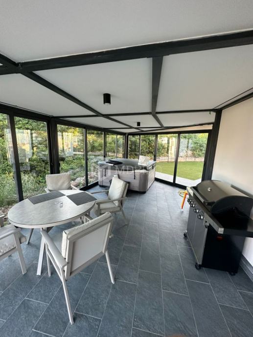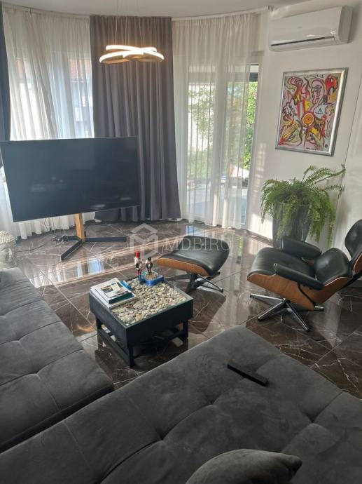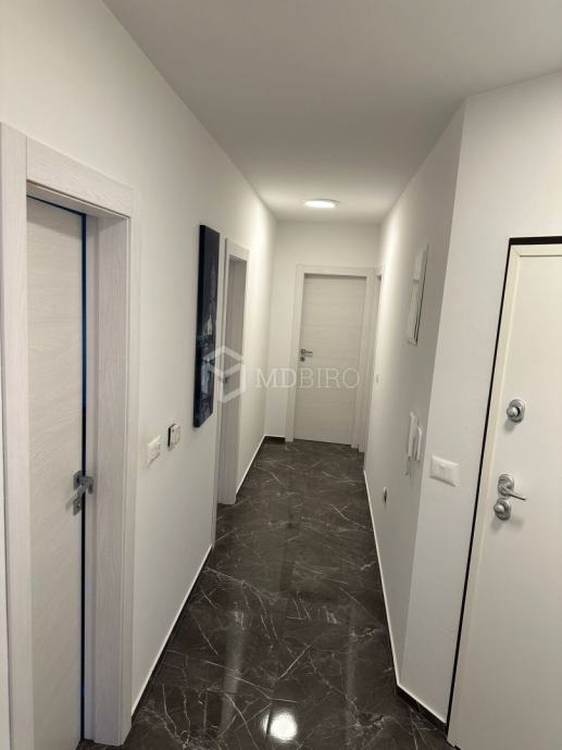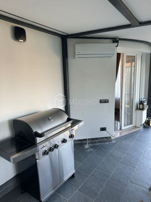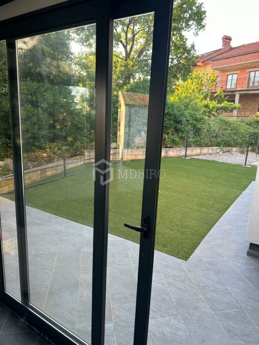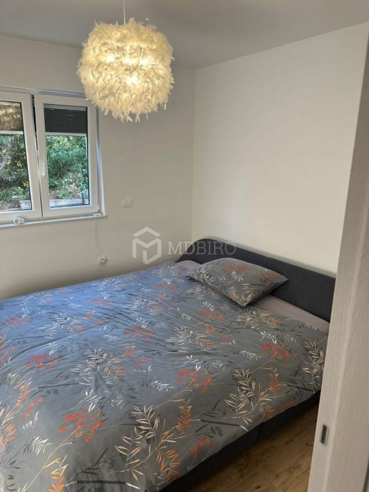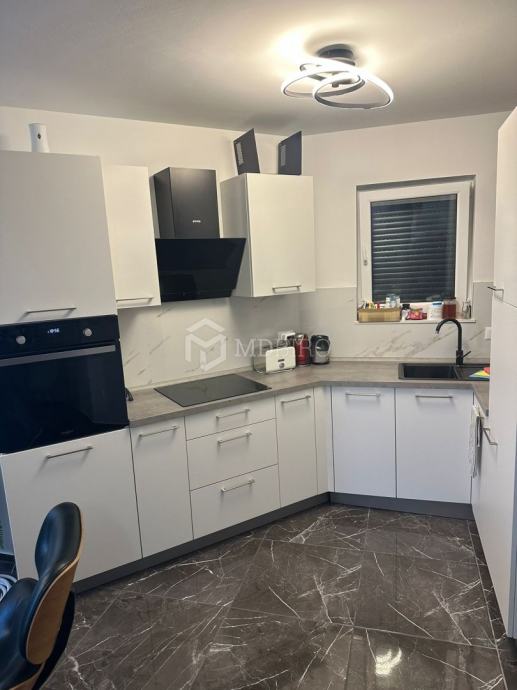 Na savršenoj lokaciji, u neposrednoj blizini autobusne stanice, trgovine i izlaza sa zaobilaznice prodaje se etaža s pogledom na more. Stan se sastoji se od zajedničkog prostora kuhinje, blagovaonice i dnevnog boravka, tri spavaće sobe, hodnika i kupaonice s prozorom, ukupne površine 70 m². Iz dnevnog boravka se izlazi na predivnu natkrivenu i zatvorenu terasu od 40 m² i vrt od 150 m². Terasa je opremljena s vanjskim hidromasažnim bazenom i roštiljem. Dva natkrivena parkirna mjesta na velikoj okućnici s vlastitom punionicom za električna vozila. Podno grijanje, dvije klime. Prodaje se namješteno ili prazno. Idealna nekretnina za novi obiteljski dom na mirnoj lokaciji van gradske buke, a opet blizu svih važnih sadržaja. RIJETKOST NA TRŽIŠTU! SAMO PUTEM NAŠE AGENCIJE!