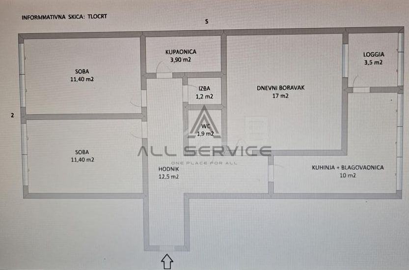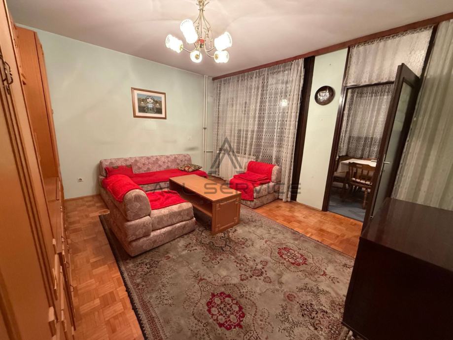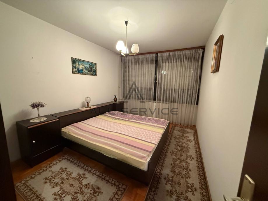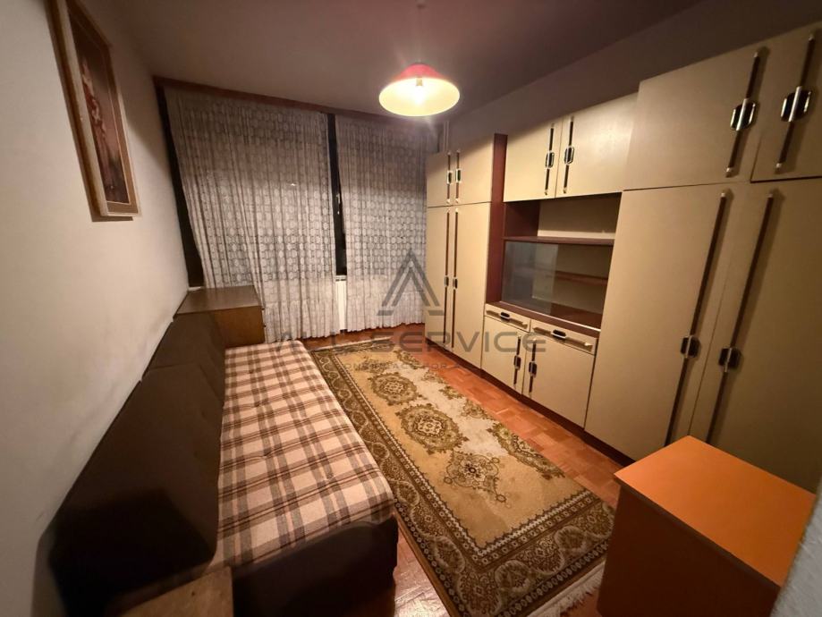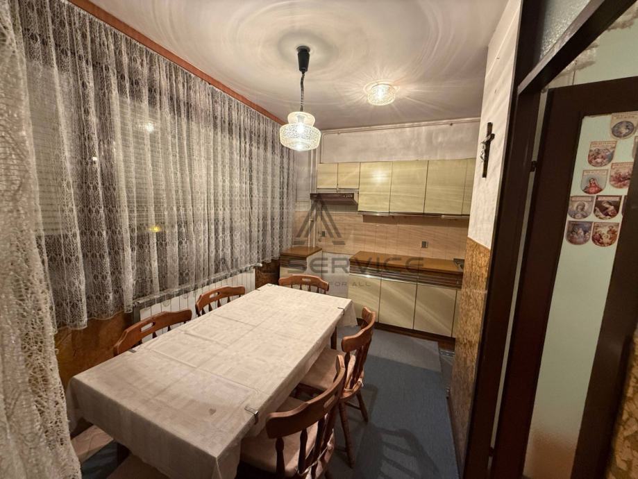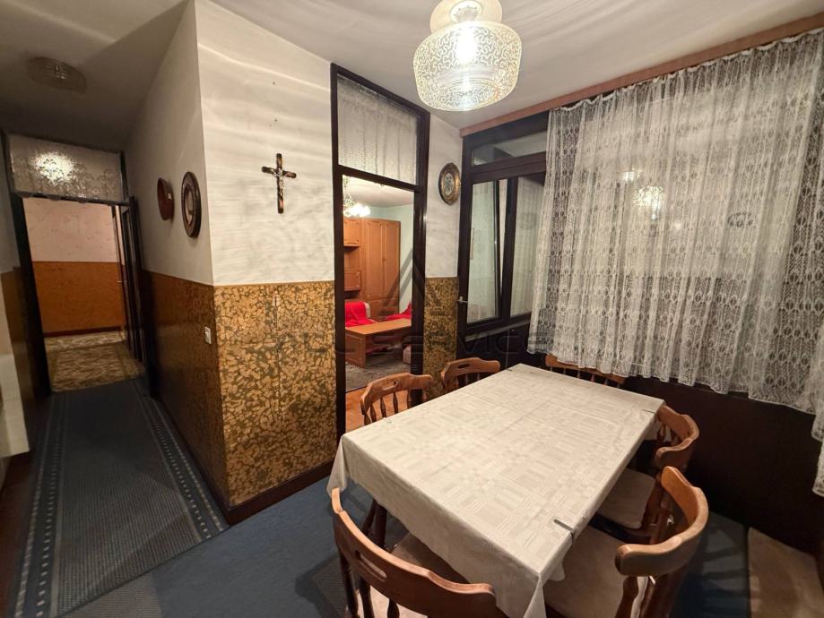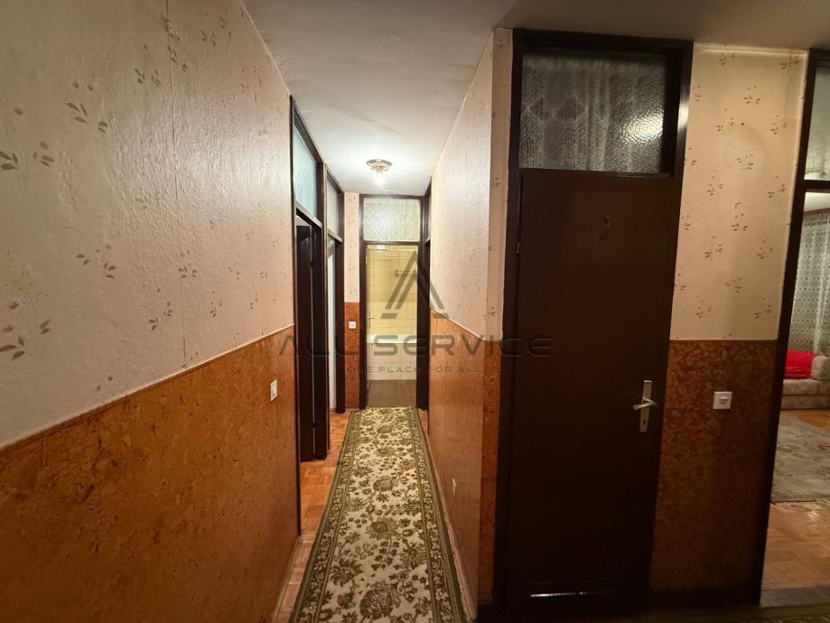 Ovaj prostrani stan smješten je u kvalitetnoj zgradi izgrađenoj 1983. godine, s orijentacijom istok-zapad koja osigurava obilje prirodne svjetlosti. Dvije spavaće sobe nalaze se na zapadnoj strani, dok su na istočnoj kuhinja s blagovaonom, dnevni boravak i zatvorena lođa (zatvorena PVC stolarijom). Stan je moguće preurediti u četverosobni uz minimalne zahvate, a dolazi namješten i spreman za useljenje.