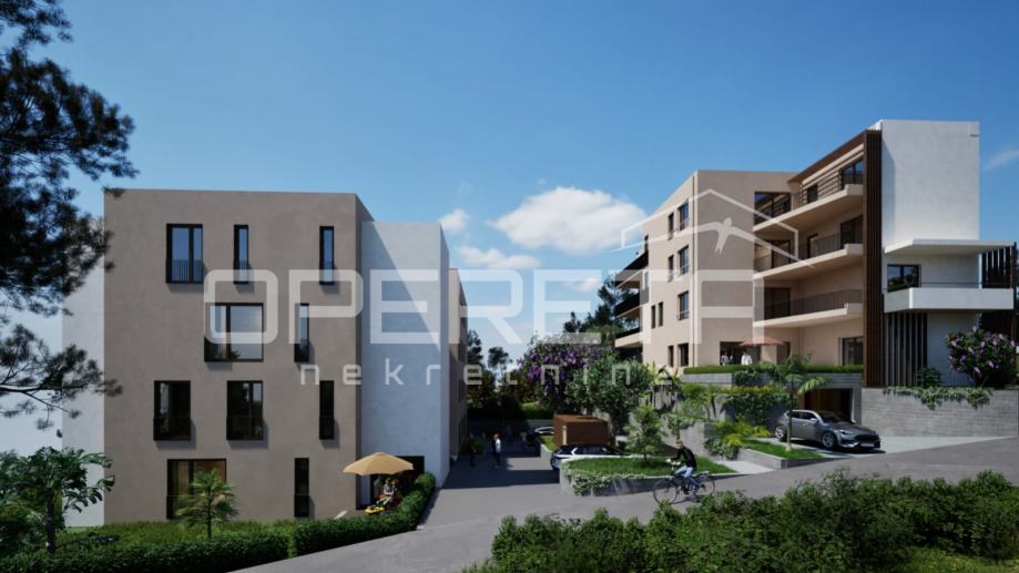 Stan se nalazi na drugom katu zgrade te se sastoji od tri spavaće sobe, dvije kupaonice, kuhinje i velike dnevne sobe koja predstavlja središnji dio stana. Dnevni boravak se putem velikih kliznih staklenih stijena otvara prema prostranoj terasi, koja postaje prirodni produžetak životnog prostora i idealno mjesto za opuštanje i boravak na otvorenom. S terase se pruža predivan, otvoren pogled na more i okolni krajolik, koji dodatno doprinosi kvaliteti i posebnosti ovog stana.
