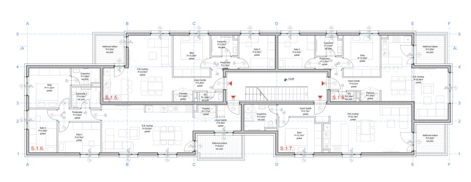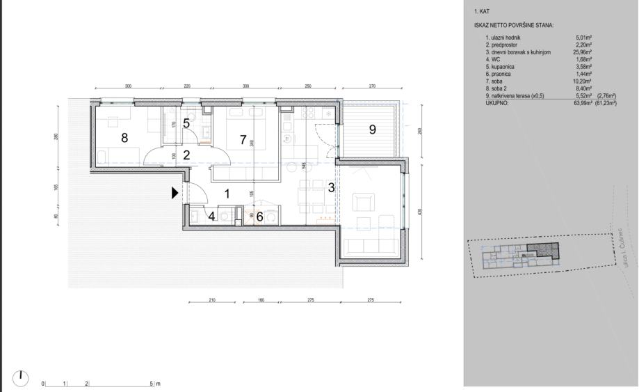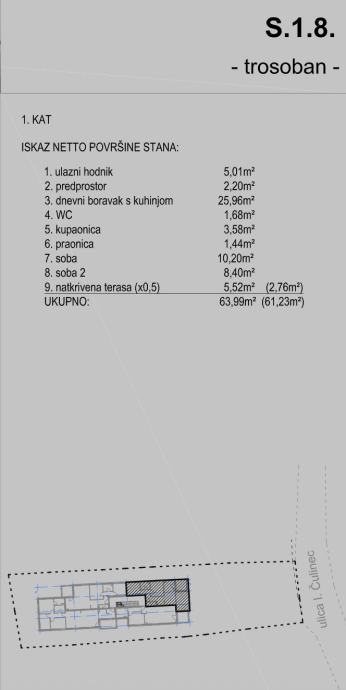 Na prodaju trosobni stan oznake **S 1.8**, površine **63,99 m² bruto** (obračunski 61,23 m²), smješten na **prvom katu** moderne zgrade u mirnoj ulici u naselju Čulinec, Zagreb. Stan se odlikuje funkcionalnim rasporedom prostorija, natkrivenom terasom i ugodnom orijentacijom **sjever–istok**. U cijenu je uključeno i **vanjsko parkirno mjesto** površine 3,00 m² (obračunski).