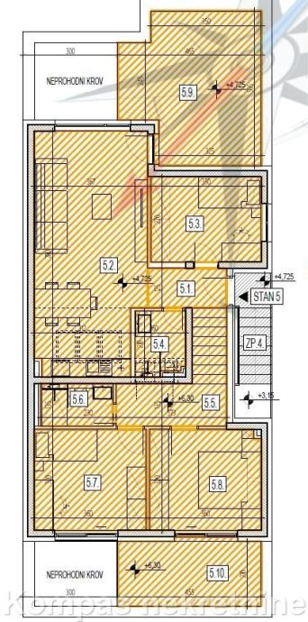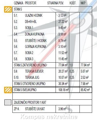 Novi 4-soban penthouse ( 108 m2 ) na drugom katu manje stambene zgrade, Gospočak. Sastoji se od ulaznog hodnika, dnevnog boravka, kuhinje, tri spavaće sobe, dvije kupaonice, dvije terase. Stambeni dio površine je 78m2, terase stvarne površine 30m2, obračunski 85,42 m2. Ima protuprovalna vrata, videoportafon, nadzorne kamere, njemačke PVC prozore se šest komora, troslojna stakla, rolete na struju, komarnike, klima uređaj, visinu stropova 284 cm, dizalicu topline/ podno grijanje, ugrađene filtere za vodu.