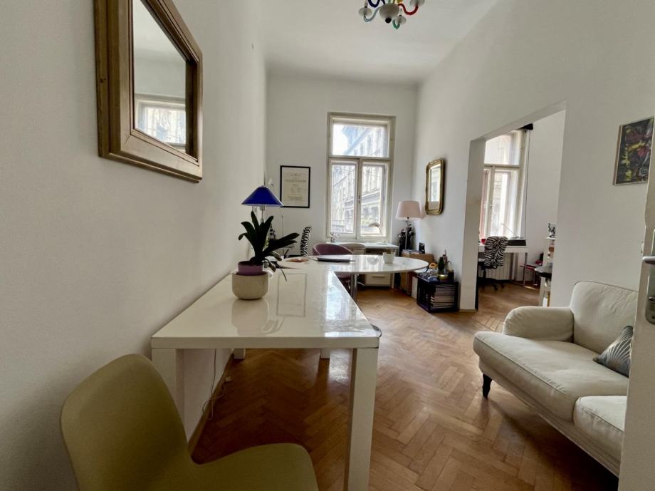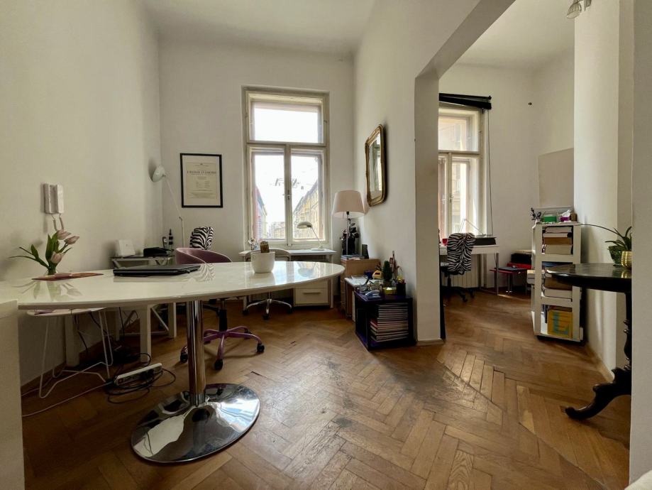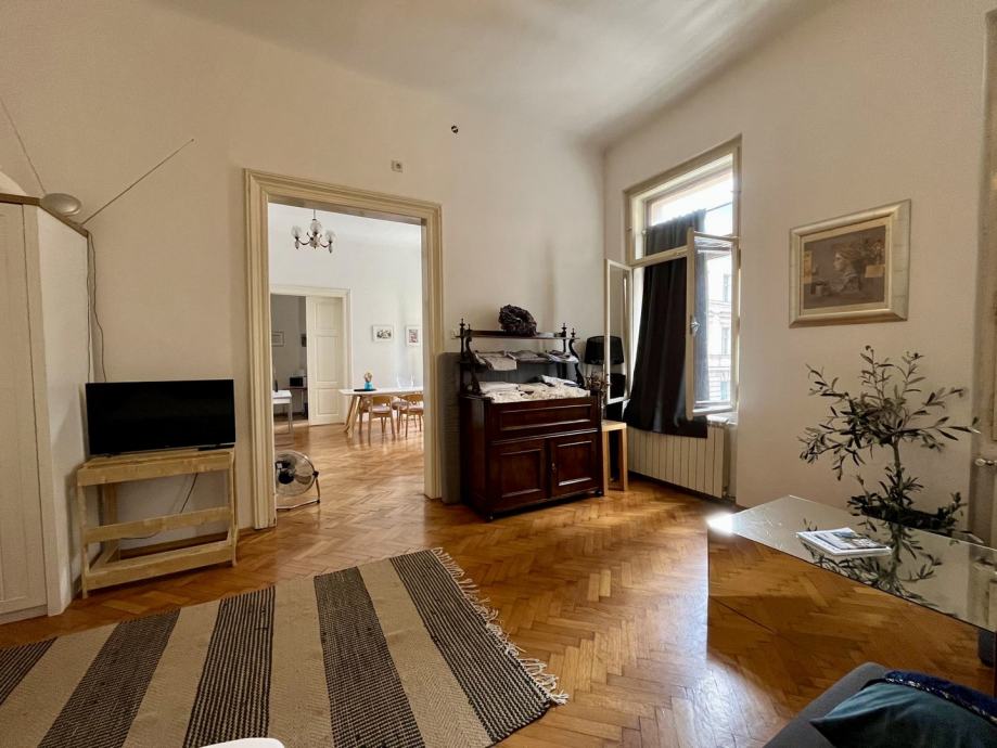 Prodajemo prostran građanski četverosobni stan visokih stropova, koji se nalazi na 1. katu stambene zgrade u Palmotićevoj ulici. Stan se sastoji od 4 sobe, blagovaonice s kuhinjom, kupaonice s WC-om, te zasebnog WC-a, te ulaznog predsoblja. Stanu pripada i šupa u podrumu, te vanjsko parking mjesto u dvorištu zgrade.