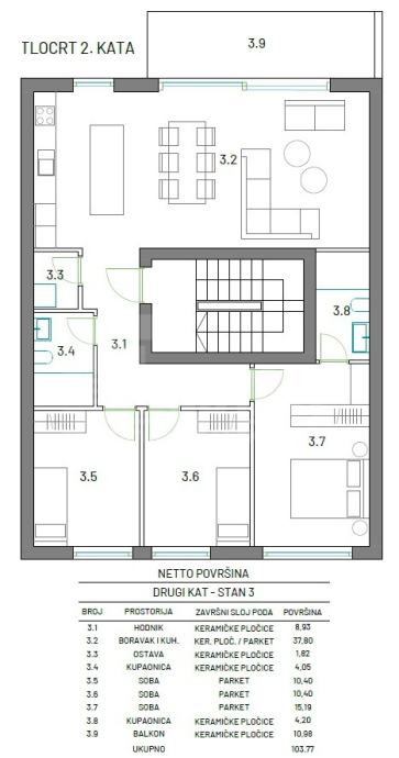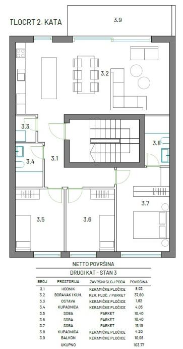 Ukupne tlocrtne površine od 103,77 m2 s balkonom. Obračunske površine (s uključenim koeficijentom za balkon) = 98,28 m2