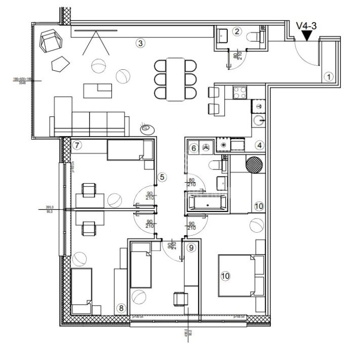 Ulazni prostor, hodnik, kupaonica, dodatni WC, kuhinja, blagovaonica i dnevni boravak, 3 spavaće sobe + glavna spavaća soba s garderobom.