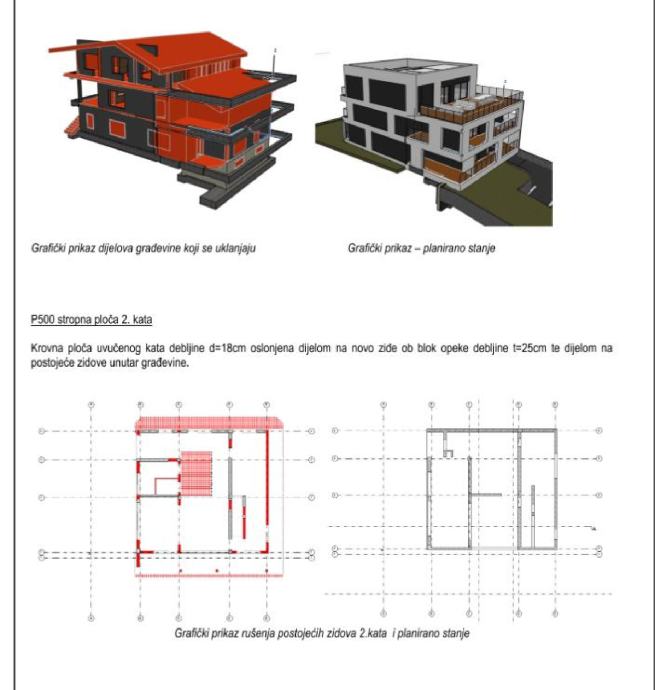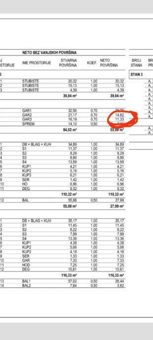 5 sobni stan, zgrada sa 3 stana, visoko prizemlje, ukupna površina 157 m2, stan 110 m2, balkon obračunski 30,48 m2, garaža površine 21 m2 obračunski 14,82 m2, parking u dvorištu obračunski 3,12 m2.