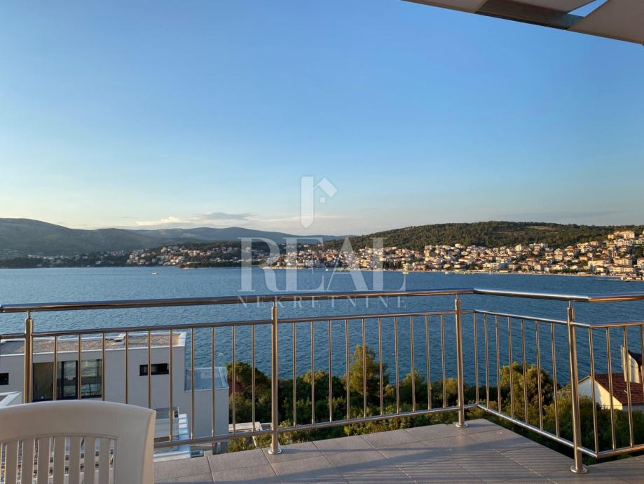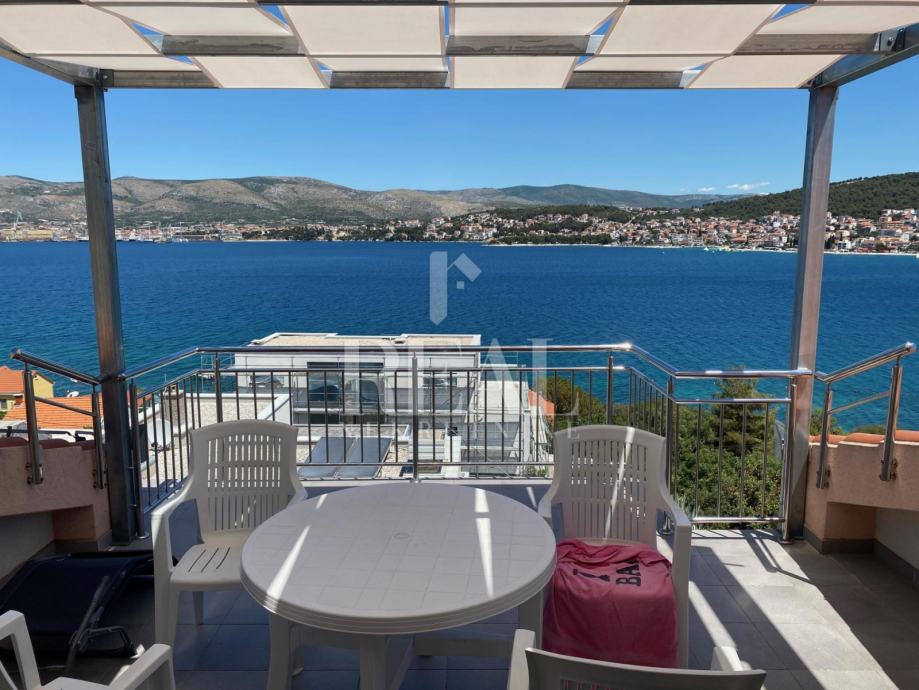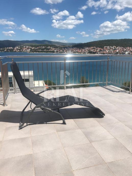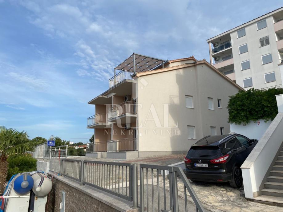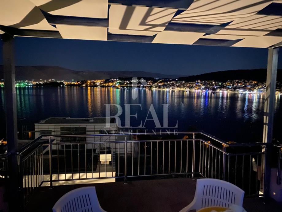 Stan je kompletno namješten, klimatiziran i sastoji od dnevnog boravka s staklenom stijenom i pogledom, blagovaonice, kuhinje, spavaće sobe, kupaonice te balkona-terase. Stanu pripada parkirno mjesto u privatnom dvorištu. Zgrada je rađena kvalitetno te svaki stan ima protuprovalna vrata, termo fasadu i velike staklene stjenke u dnevnom boravku s pogledom na more. Odlična lokacija za uživanje u pogledu i odmoru.