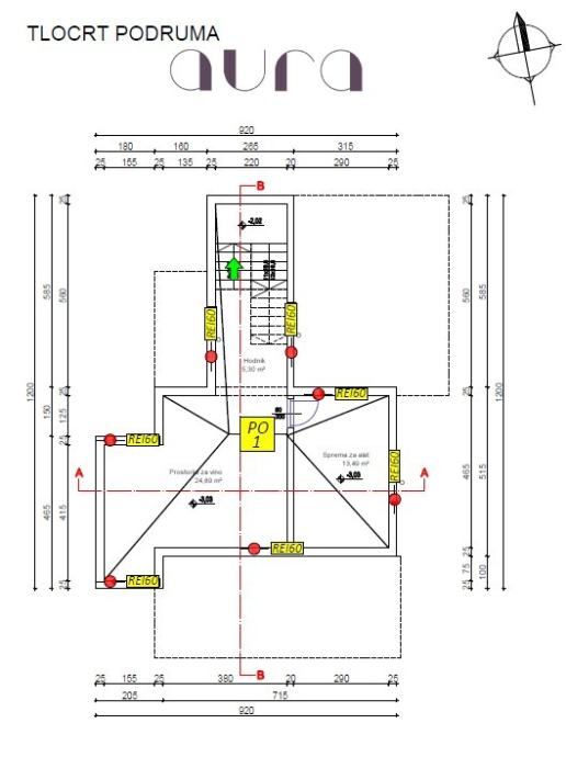 U podrumu se nalazi hodnik koji vodi do prostorije za vino i spreme za alat.