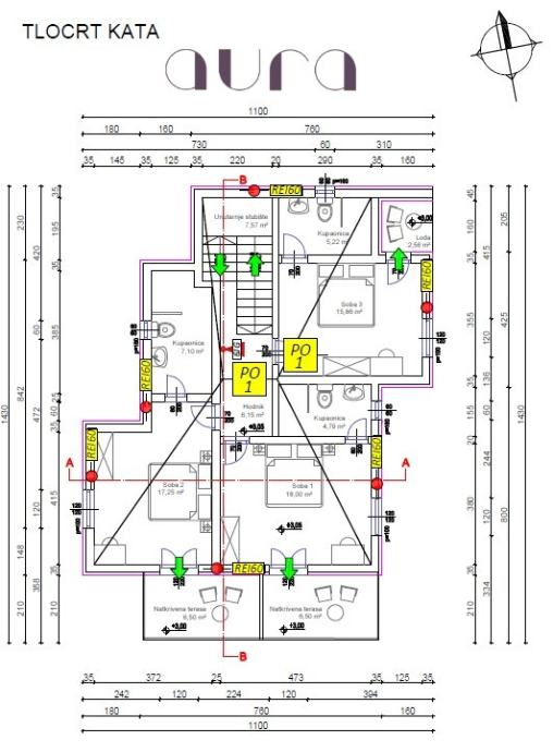 Na etaži prvog kata nalazi se hodnik i tri spavaće sobe sa kupaonicama. Sjeveroistočna