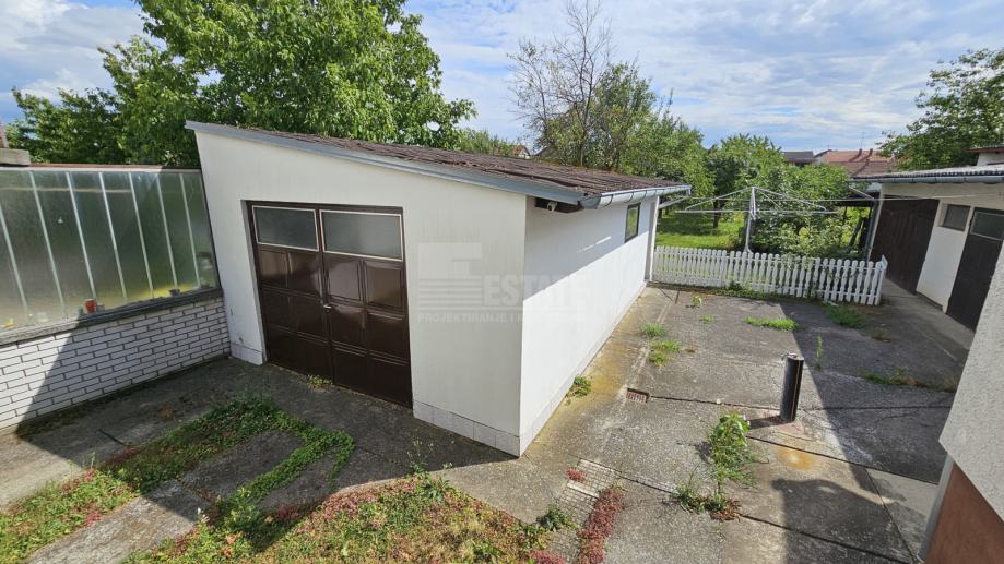Okućnica sadržava spremište u suterenu (uz terasu kuće), ljetnu kuhinju, garažu, spremište i pušnicu - sve u nizu iza kuće, te samostojeći zasebni objekt koji sadržava veću garažu za do dva automobila (jedan iza drugoga). Ispred garaže na vlastitoj čestici moguće parkirati dodatna dva automobila. Iza pomoćnih objekata prema kraju parcele nalazi se veća ozelenjena površina s voćnjakom. Zemljište je ograđeno i sjajno za djecu, hobije, druženja ili uzgoj voća/povrća i sl.