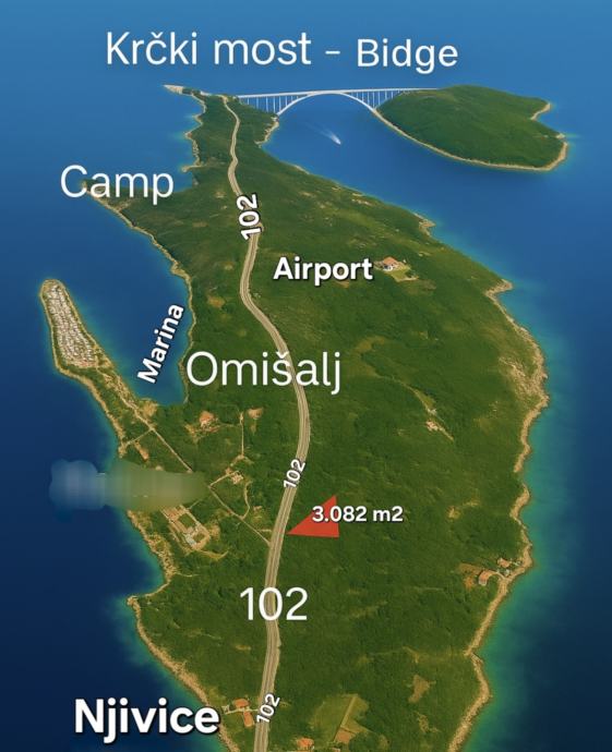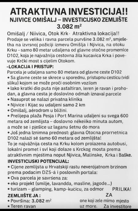 Prodaje se velika i ravna parcela površine 3.082 m², smještena na izvrsnoj poziciji između Omišlja i Njivica, na otoku Krku – samo 80 metara udaljena od glavne otočne prometnice D102, koja je najvažnija cestovna žila kucavica Krka i povezuje Krčki most s cijelim Otokom.
