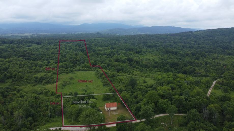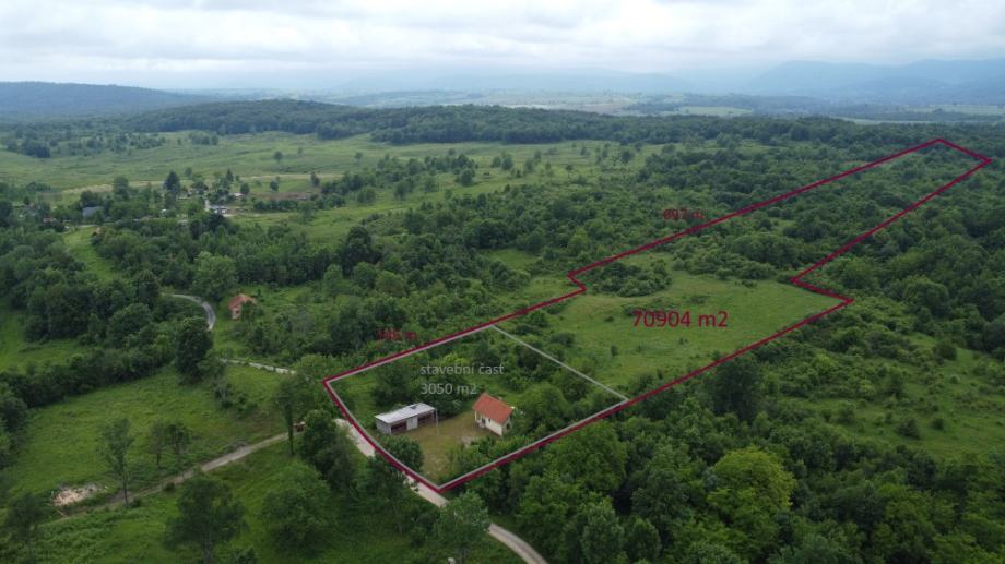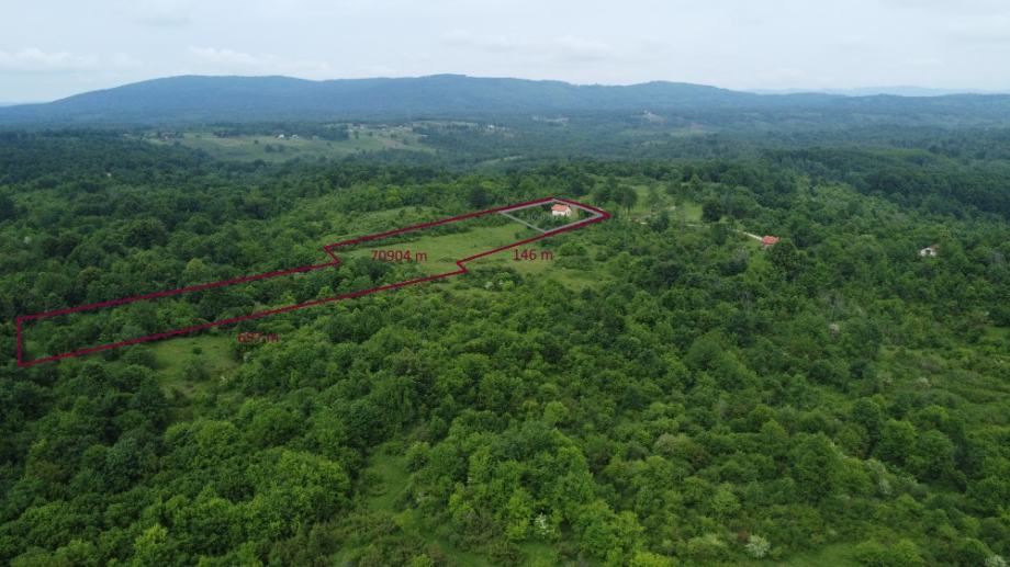 Građevinski dio zemljišta je 3.050 m2(označeno bijelom crtom na fotografijama), ostatak je livada, voćnjak, zrela šuma.