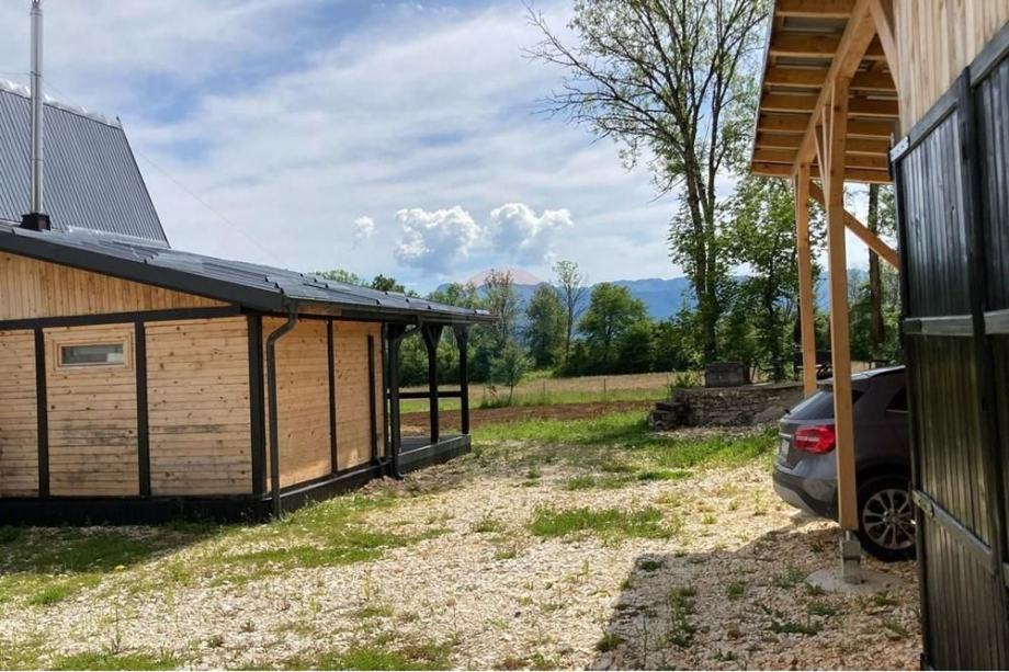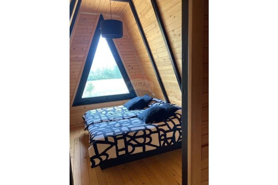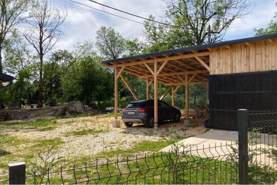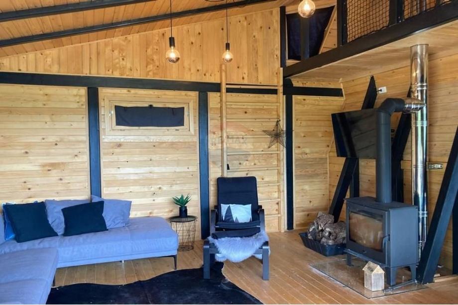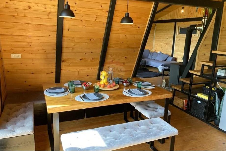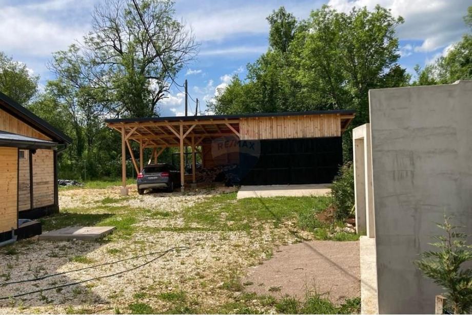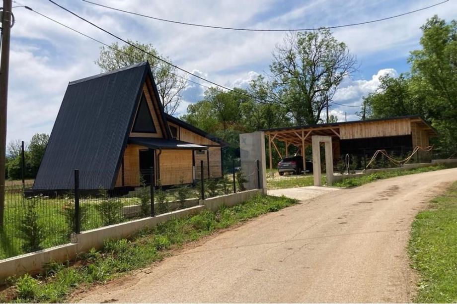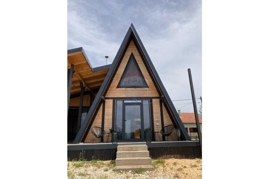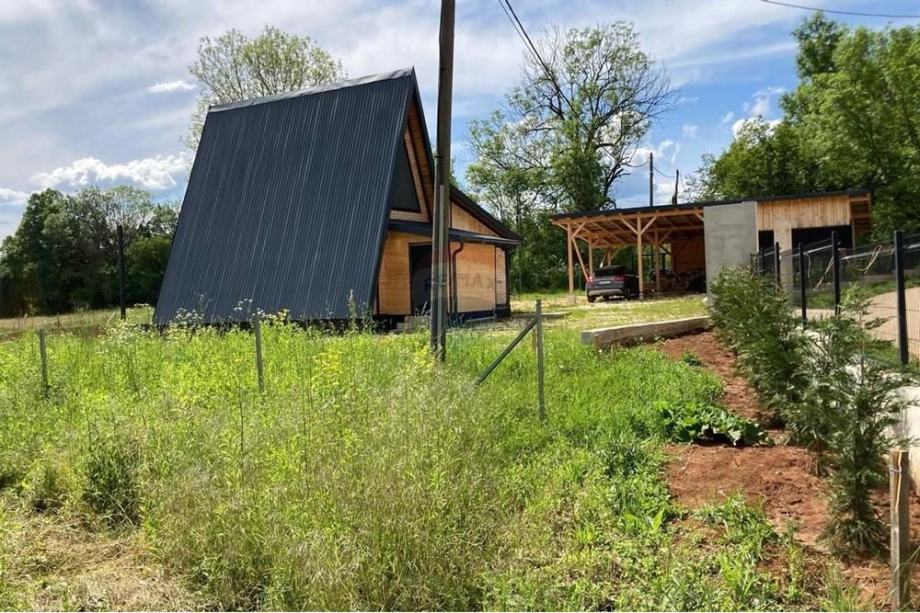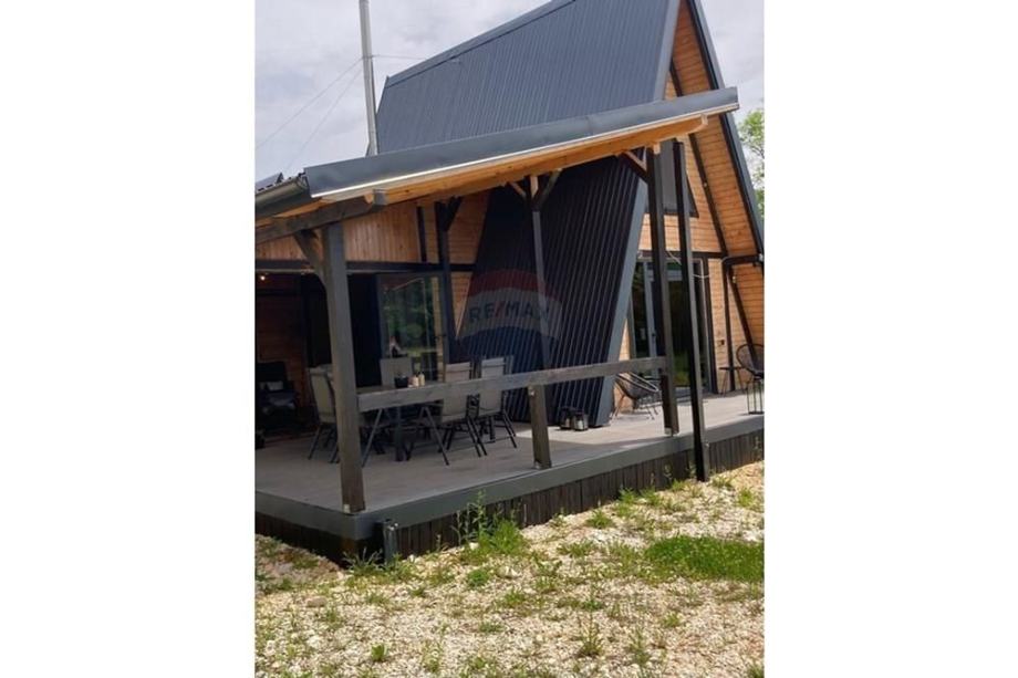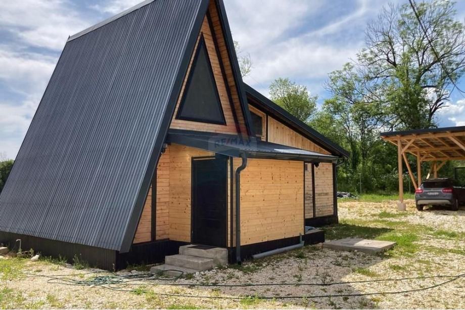 Prodaje se A frame kuća koja se nalazi na čestici veličine 17465 m2. Kuća je legalizirana i ima uporabnu dozvolu. Uz kuću je 2000 m2 čestice također građevinsko zemljište. Kuća je izrađena od hrastovih greda sa pravim temeljima te izolirana sa 20 cm kamene vune. Kuća je kompletno namještena a sastoji se od kuhinje, blagovaonice, 2 Wc-a + kupaonice, galerije sa igraonicom i dvije spavaće sobe na katu. Ispred kuće se nalazi garaža i natkriveni parking za 2 vozila. Grijanje je na drva + klima uređaj. Kuća je opremljena kamerama, internetom (wifi).