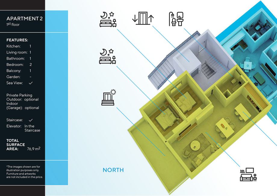Raspored: Dvije prostrane spavaće sobe, elegantna kupaonica, prostrani dnevni boravak s kuhinjom i blagovaonicom - prostor za obiteljski život ili opuštanje s prijateljima.