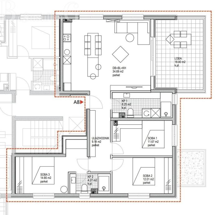 Na drugom katu moderne stambene zgrade, u mirnom okruženju s predivnim panoramskim pogledom na dvorac Januševac, šumu i Samoborsko gorje, nalazi se stan A8 – dom koji spaja sofisticirani dizajn, energetsku učinkovitost i funkcionalnost.