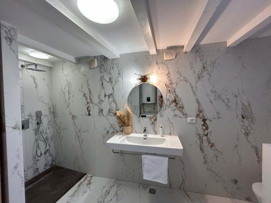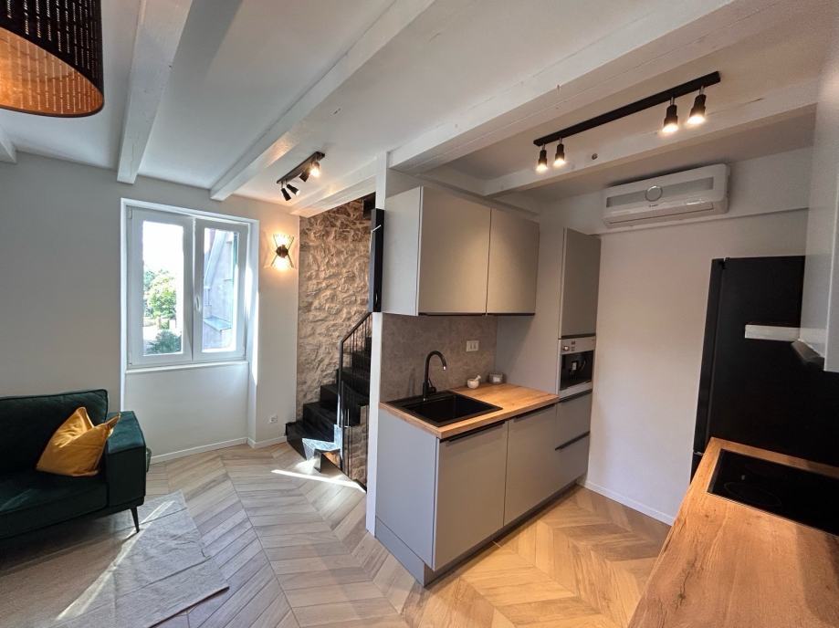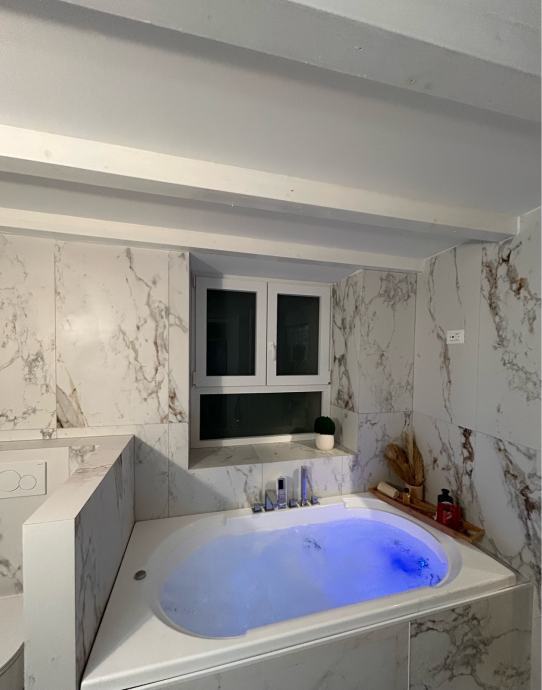 Posredujemo pri prodaji kompletno i vrlo kvalitetno adaptirane kamene kuće, koja se može kategorizirati kao kuća za odmor sa četiri zvjezdice, 50 metara od mora i ima djelomičan pogled na more. Pored kuće je parking koji većinom koriste stanari. Renovirani su podovi, krov, strujna i vodovodna instalacija, svi zatvori i protuprovalna vrata. U prizemlju je kupatilo sa saunom, jacuzzi kadom i tuš kadom), na prvom katu je dnevni dio sa kuhinjom i u potkrovlju spavaća soba. Kuća se prodaje s opremom i namještajem koji su u cijeni, useljiva odmah. Dokumentacija uredna, pogodna za kredit. Fantastična lokacija.