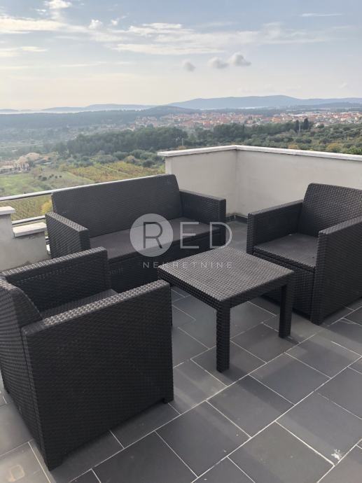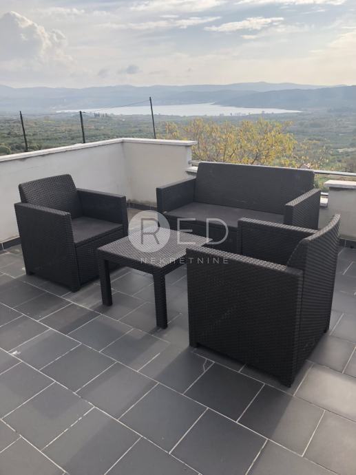 Kući pripadaju i dvije terase, jedna sa pogledom na more, sa koje se vidi cijeli šibenski arhipelag i površine je 20 m2. Druga terasa je opremljena vanjskim roštiljem i površine je 25 m2, okrenuta prema predivnom, mirnom, prirodnom dijelu visinskog djela Donjeg Polja. Parkirno mjesto je nadkriveno.