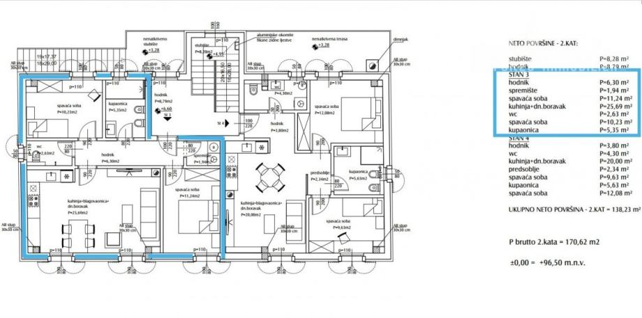Stan se sastoji od dvije spavaće sobe, kuhinje sa dnevnim boravkom i blagovaonom, jedne kupaonice, dodatnog odvojenog wc-a i ostave.