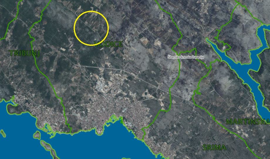 Poljoprivredno zemljište sa šumom i livadom u podnožju brda Okit na kojem se nalazi Crkva Gospe od Karmela.