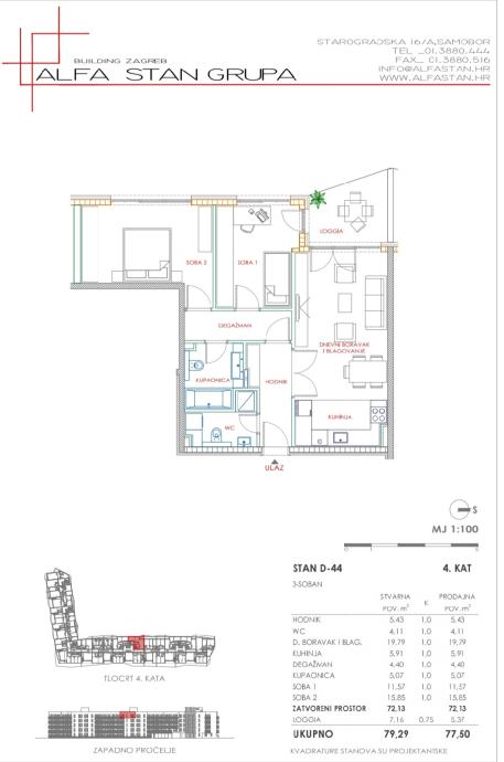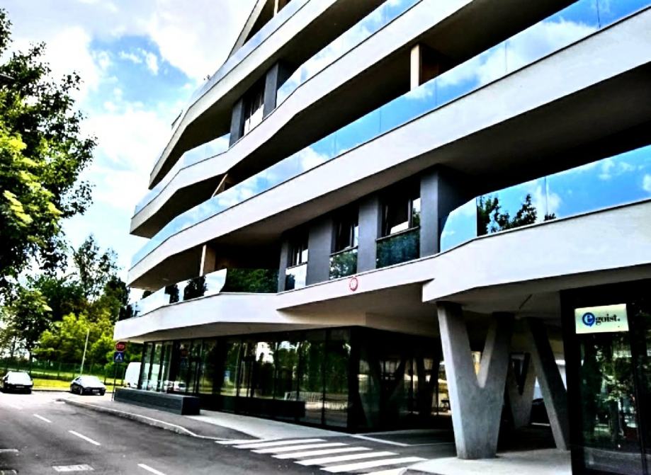 Stan se nalazi na 4.katu(zadnjem) atraktivne, izuzetno kvalitetne i moderne zgrade iz 2018. , Alfa stan gradnja. Zgrada se nalazi u Cvjetnom naselju, Veslačka ulica. Stan ima obračunski 80,63m2, stvarne površine 91,79m2, neto korisne površine 77,50m2. Stan je trenutno 2-soban. Sastoji se od ulaznog hall-a sa gostinjskim wc-om/vešeraj i ugradbenim ormarom open space dnevnim dijelom-kuhinja sa otokom, dnevni boravak, blagovaona, te spavaćim dijelom-spavaća soba sa 2 staklena ugradbena ormara, kupaonica sa wc-om, te radni dio sa radnim stolom. Po originalnom tlocrtu je 3-soban, te su uz minimalan zahvat može modificirat.Ima atraktivnu lođu sa staklenom ogradom, površine 7,16m2.Stanu pripada vanjsko parkirno mjesto. Vanjsko parkiralište zgrade ima rampu,video nadzor,rasvjetu. Moguća je kupnja ili najam garažnog parkirnog mjesta ili garaže,ovisno o dostupnosti.U stanu se nalaze staklene stijene,ugradbeni stakleni ormari, epoksi zid, najkvalitetnija keramika, hrastovi parketi, ugradbena kuhinja sa kuhinjskim otokom,bosch, faber,franke aparati, klima,podno grijanje,spušteni stropovi sa rasvjetom, visine 3metra.