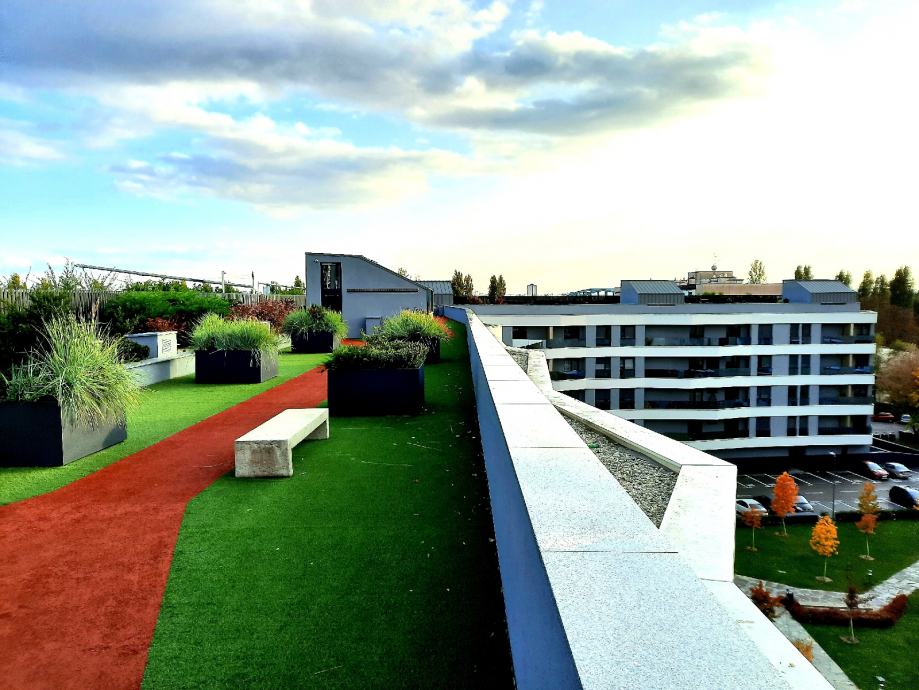 Na krovu zgrade, po cijeloj dužini,nalazi se staza za trčanje,šetalište,vježbalište, zelenilo i klupice.