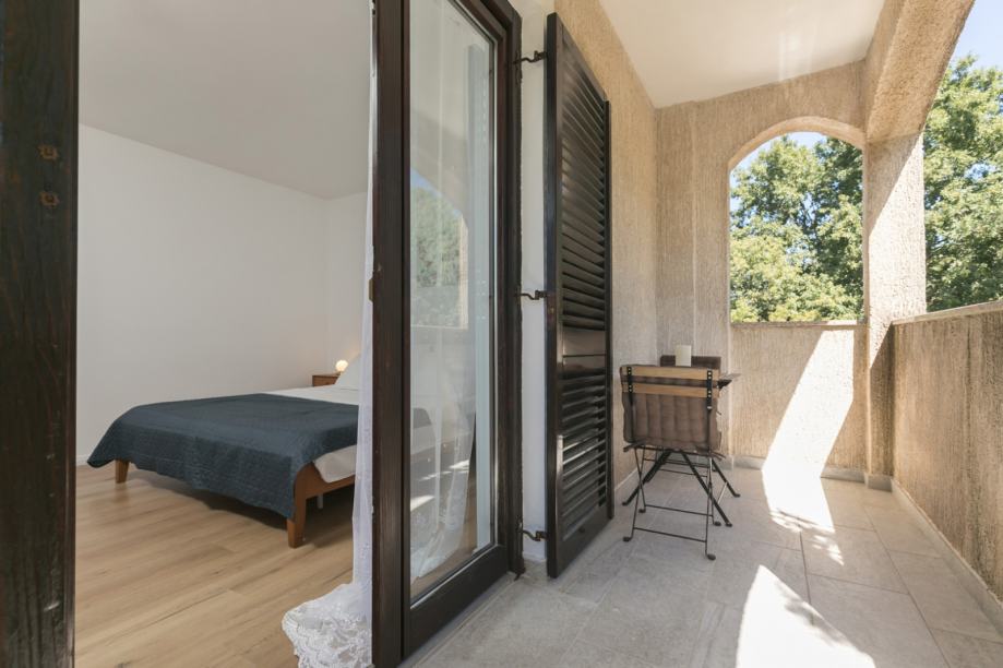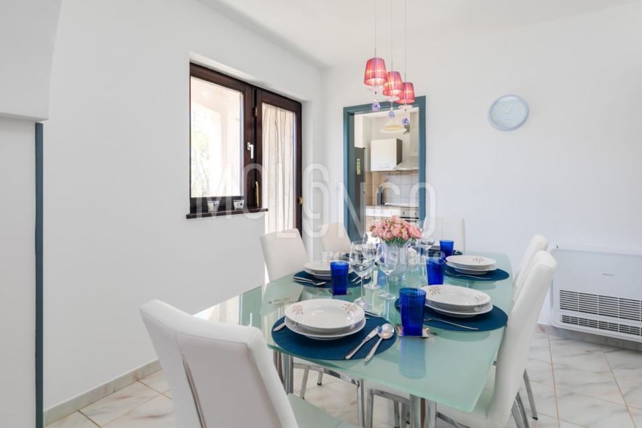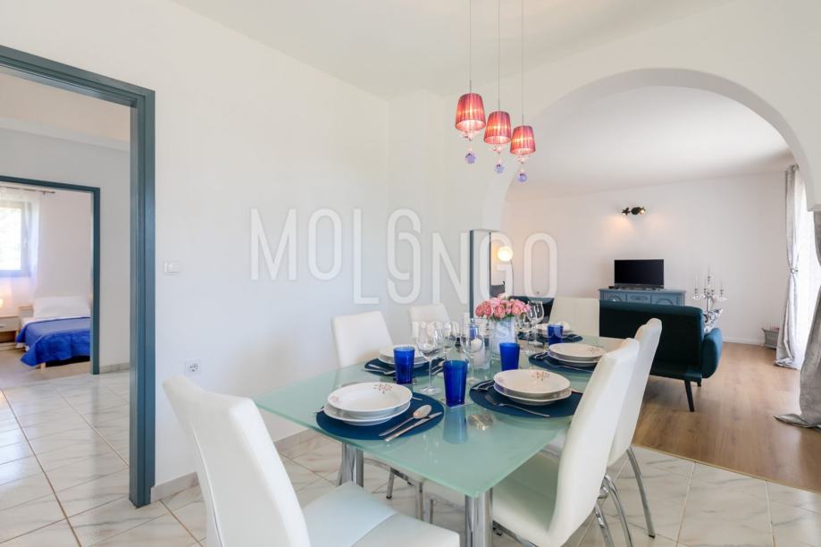 Iz dnevnog boravka i blagovaonice te spavaće sobe pristupa se terasi s koje se pruža panoramski pogled na pejzaž i more.