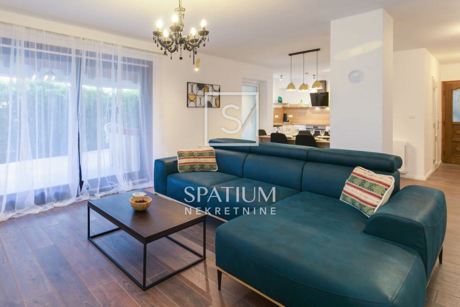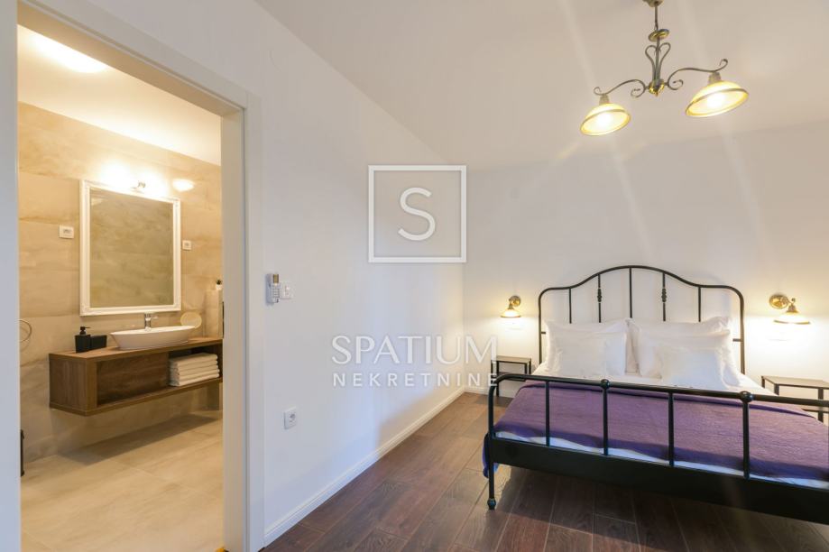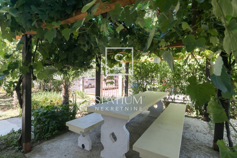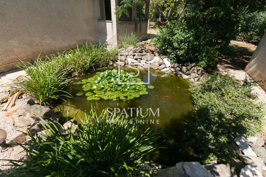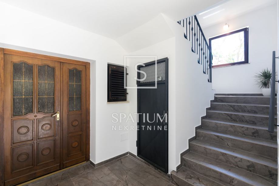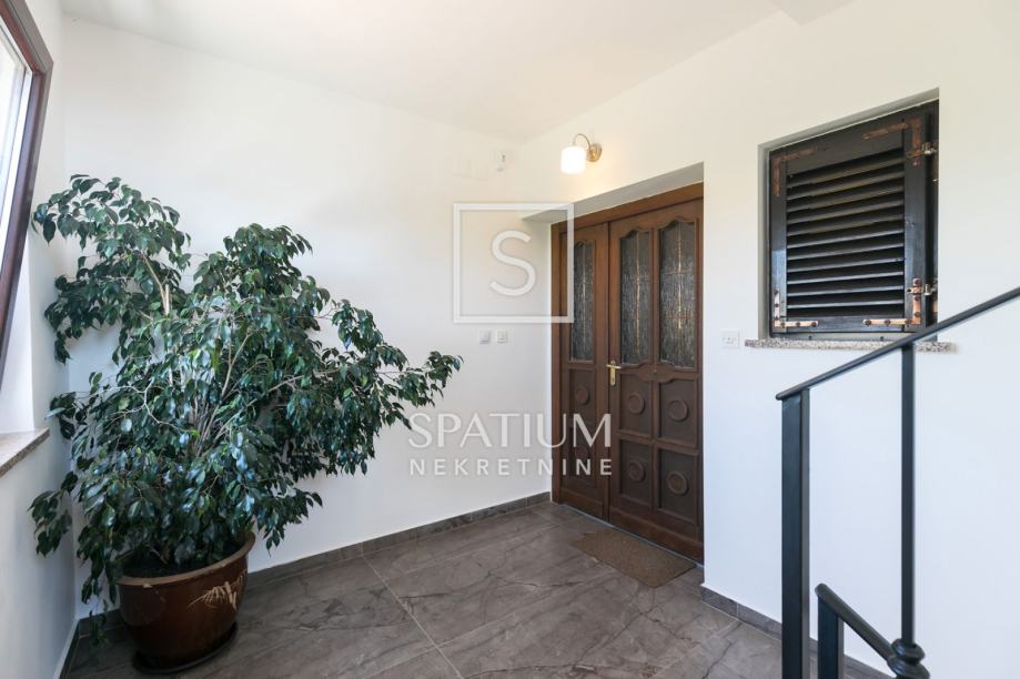 Ova lijepa kuća ukupne površine 320 m2 sa pripadajućom okućnicom od 655 m2 proteže se na tri etaže, prizemlje, kat i potkrovlje te također ima pomoćnu građevinu 21 m2, ( vrtnu kućicu ). U prizemlju su smješteni dnevni boravak s blagovaonicom i kuhinjom otvorenog tipa, 3 spavaće sobe walk in kupatilo i zasebno kupatilo. Iz dnevnog boravka i kuhinje pristupa se direktno na prostranu natkrivenu terasu površine 30 m2 sa jacuzziem i lounge zonom.