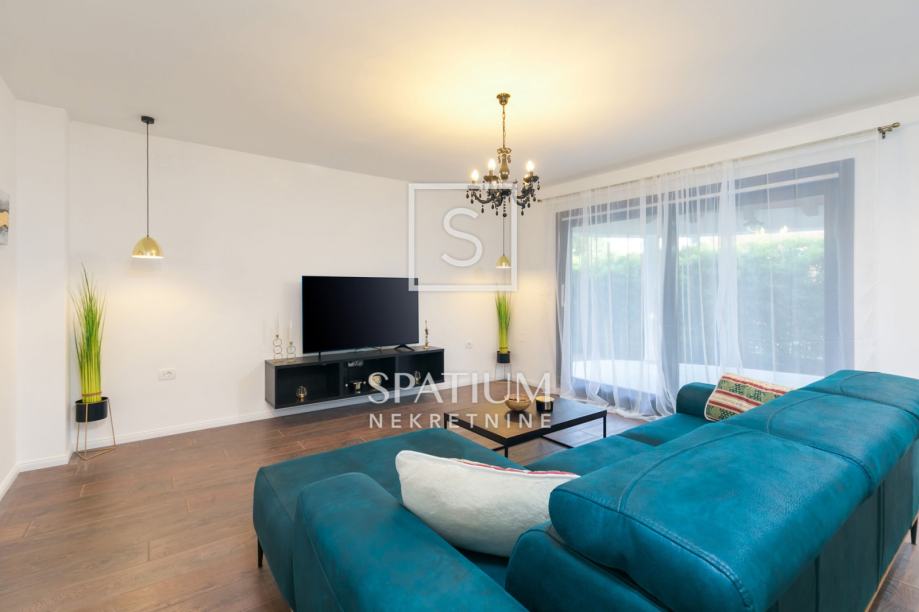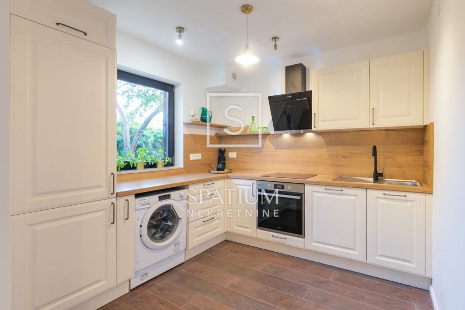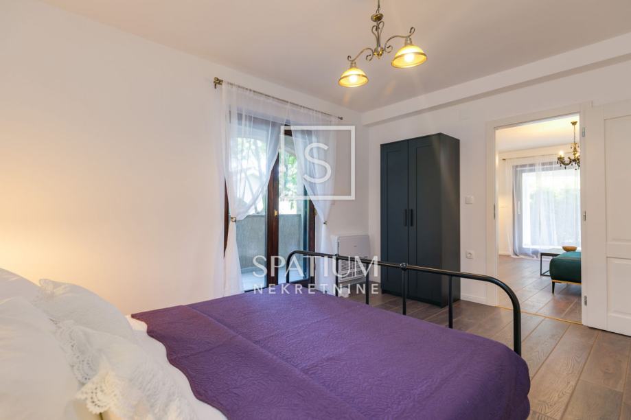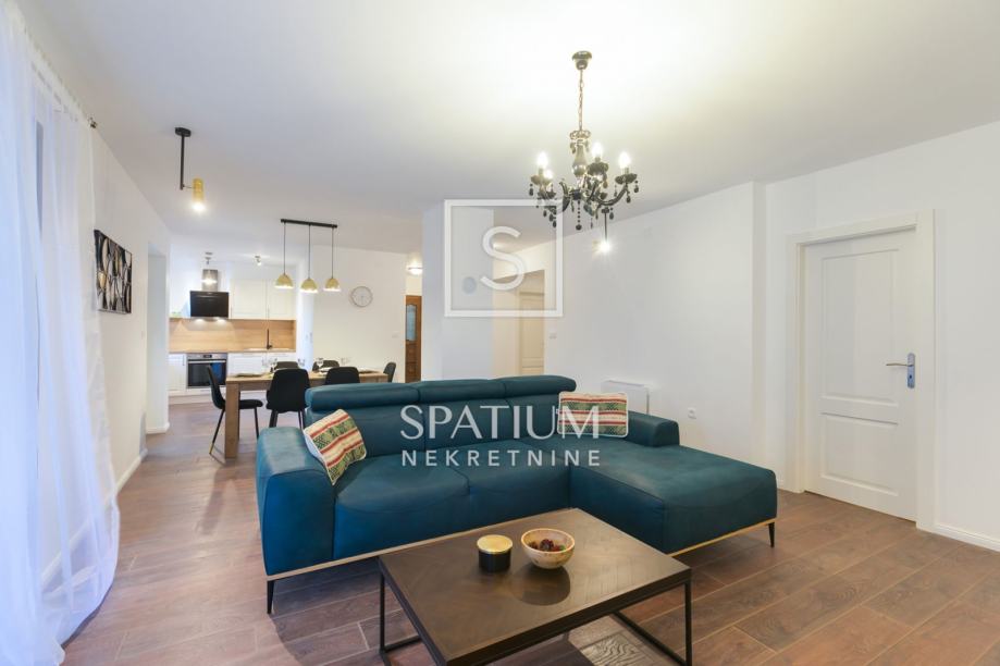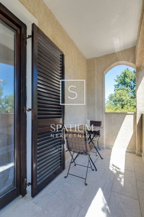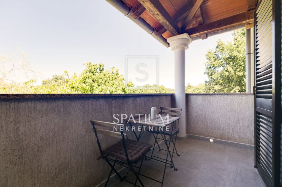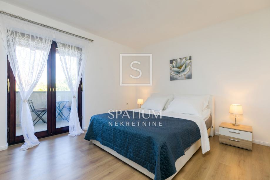 Ova lijepa kuća ukupne površine 320 m2 sa pripadajućom okućnicom od 655 m2 proteže se na tri etaže, prizemlje, kat i potkrovlje te također ima pomoćnu građevinu 21 m2, ( vrtnu kućicu ). U prizemlju su smješteni dnevni boravak s blagovaonicom i kuhinjom otvorenog tipa, 3 spavaće sobe walk in kupatilo i zasebno kupatilo. Iz dnevnog boravka i kuhinje pristupa se direktno na prostranu natkrivenu terasu površine 30 m2 sa jacuzziem i lounge zonom.