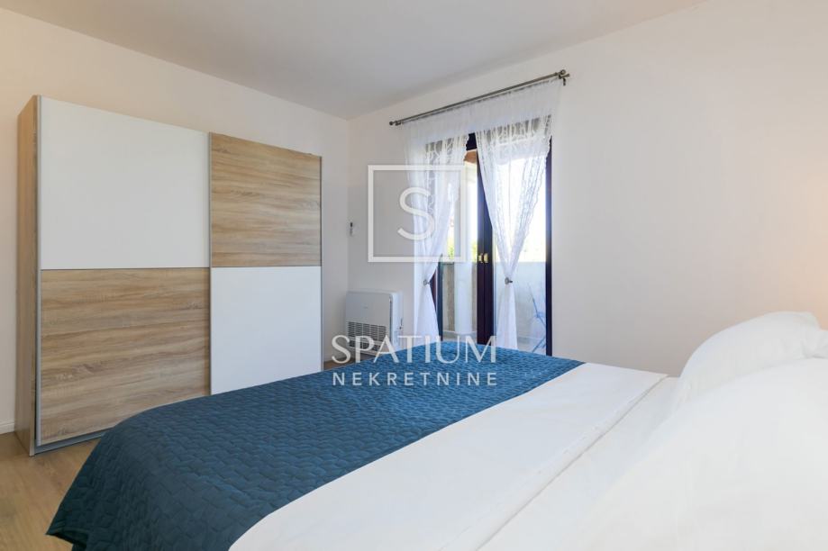 Iz dnevnog boravka i blagovaonice te spavaće sobe pristupa se terasi s koje se pruža panoramski pogled na pejzaž i more.