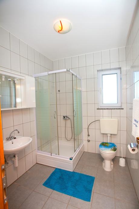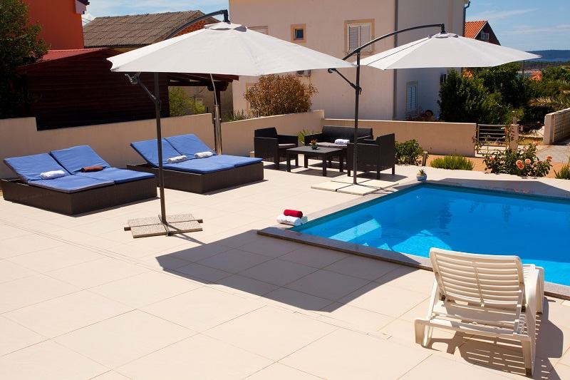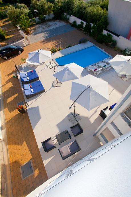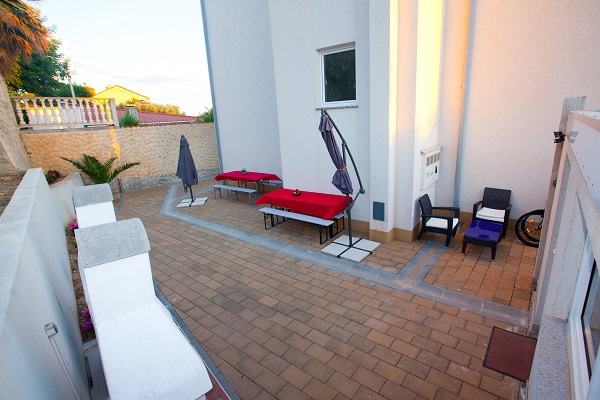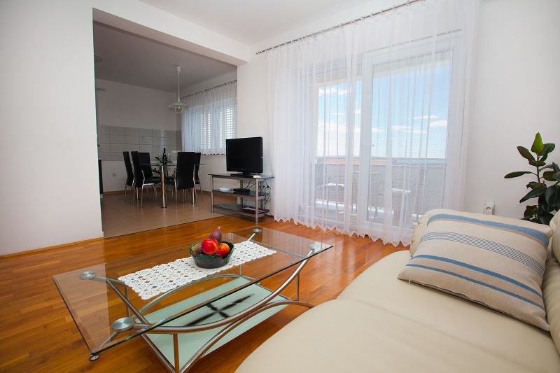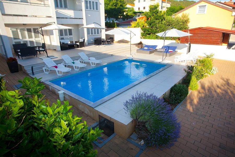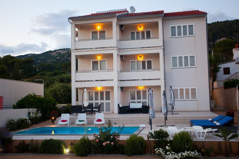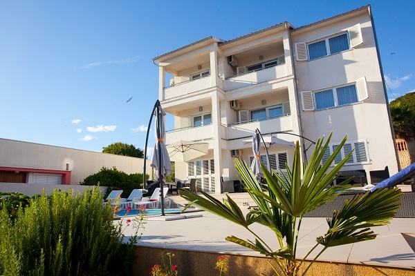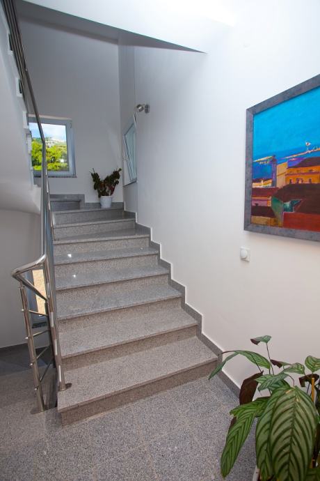 Prodaje se prekrasan jedno-etažni apartman na drugom katu (od 3), 5 soba, dvije kupaone s WC, dvije kuhinje potpuno namještene (perilica suđa, perilica rublja, pećnice, ... , dva balkona s prekrasnim panoramskim pogledom na more, moderno i kvalitetno namješten, parket hrast, na stubištu granit, bazen s velikom terasom, apartmanu pripadaju dva parking mjesta. Kuća se nalazi zračne linije 300m od mora (pješice 10min do plaže Padova 3), kvalitetna gradnja, velika okućnica, dva roštilja, okućnicu krasi mediteransko zelenilo...