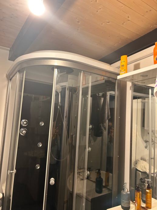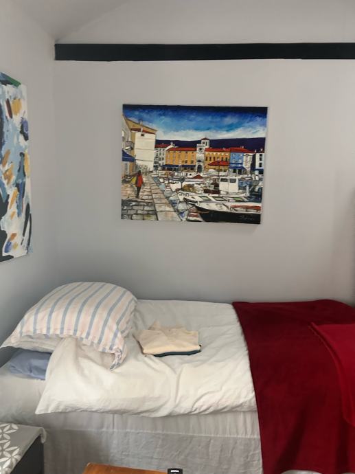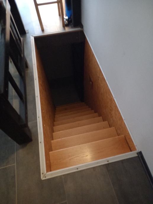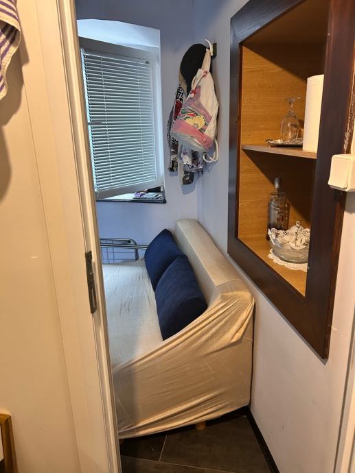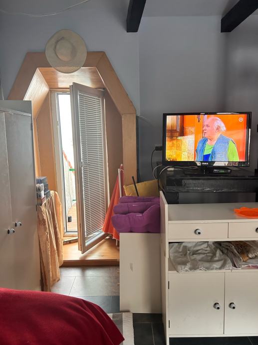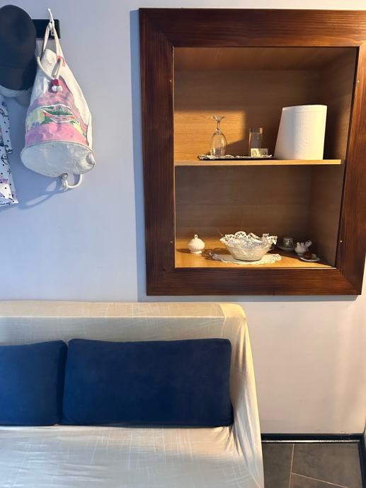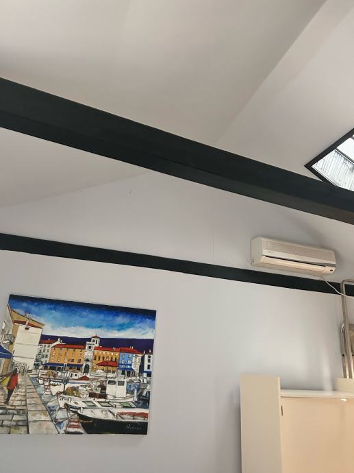 Konoba se nalazi u prizemlju kuće a apartman u potkrovlju kuće , ima visoki strop , nema kose zidove .