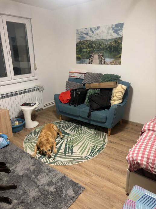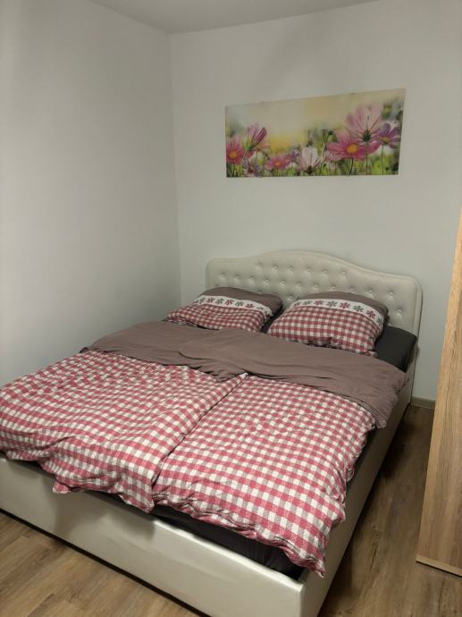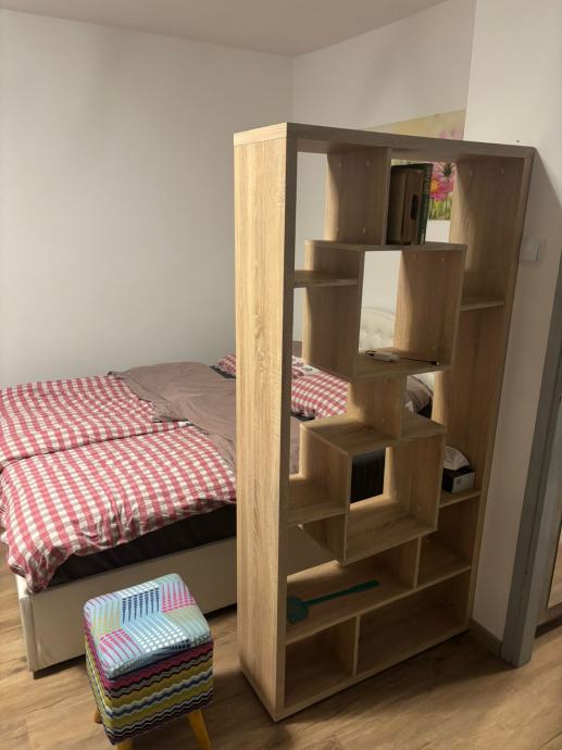 Iznajmljujem namješten apartman od 42 m² koji je spreman za useljenje. Prostor je podijeljen na spavaću sobu s bračnim krevetom i dnevni dio s blagovaonom - stol s četiri stolice i prolaz prema kuhinji. Spavaći dio odvojen je visokim regalom koji služi i za odlaganje.