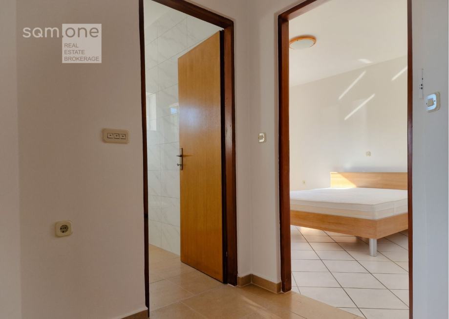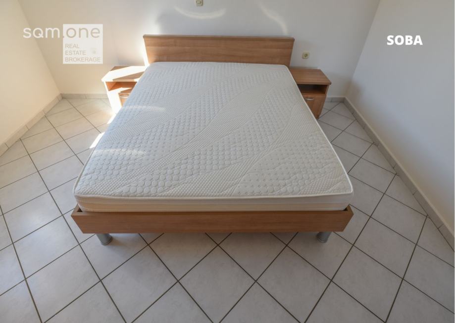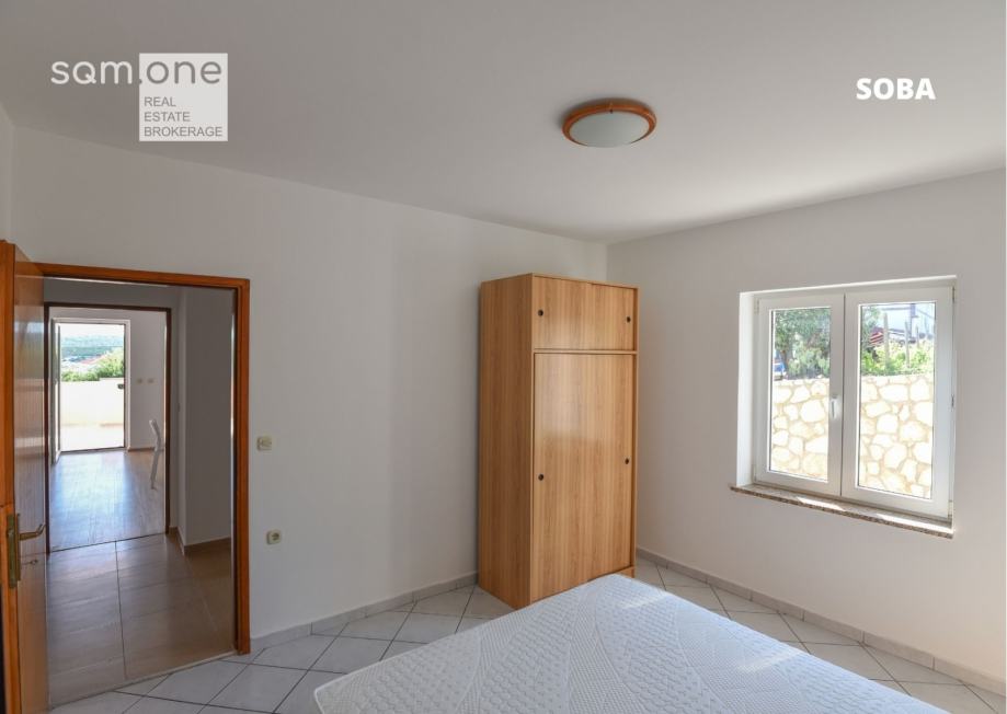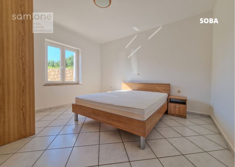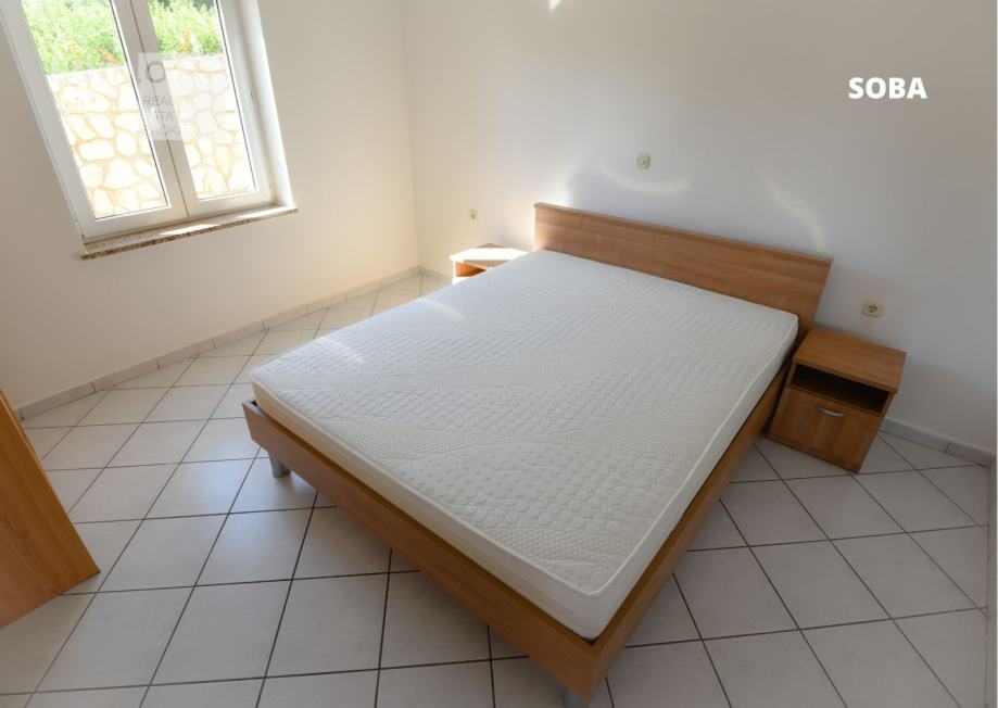 - Soba: bračni krevet, 2 noćna ormarića, garderobni ormar;