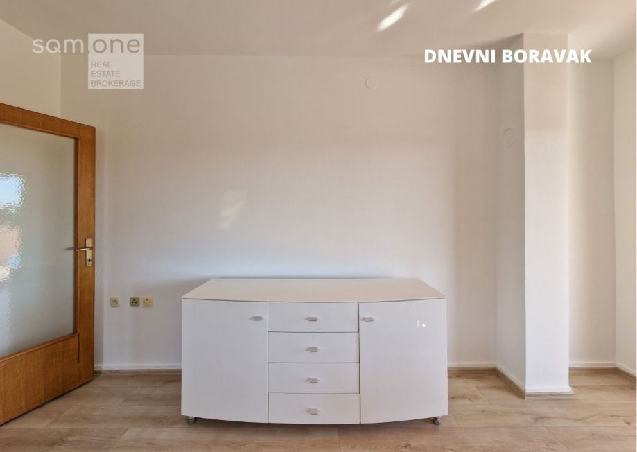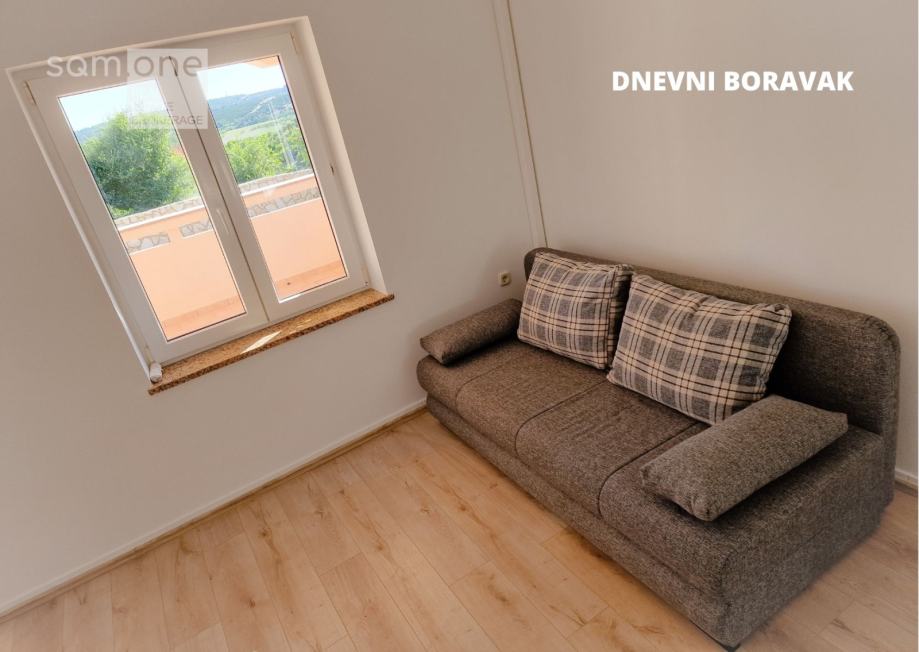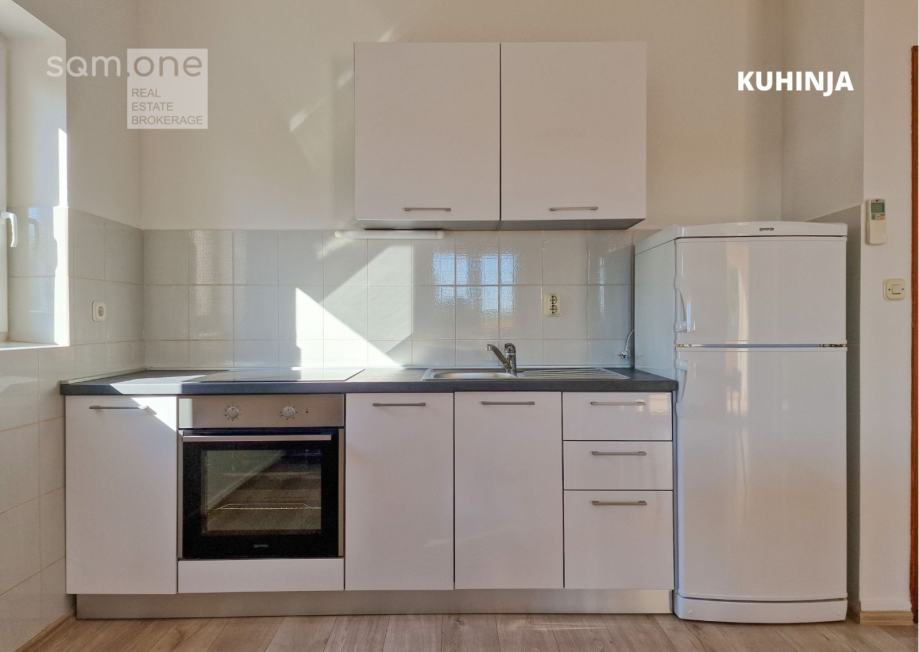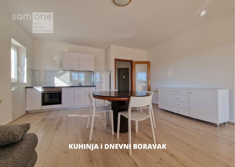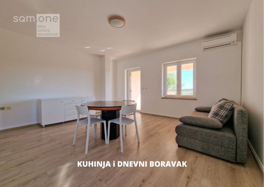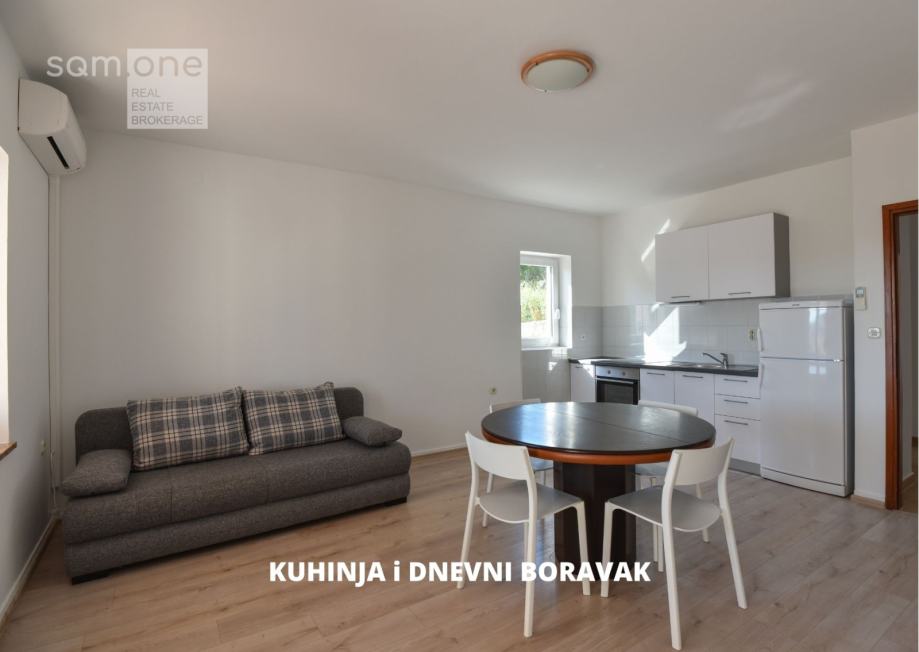 - Kuhinja i dnevni boravak: kuhinjski elementi, električni štednjak (električna ploča) i pećnica Gorenje, hladnjak Gorenje, kružni blagovaonički stol s 4 stolice, komoda, sofa na razvlačenje (spavanje za 2 osobe), unutarnja AC jedinica Daikin (vanjska jedinica smještena na fasadi u loggi), priključci za telefon i tv antenu;